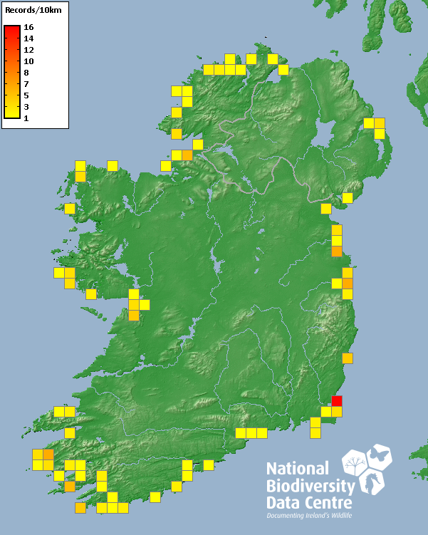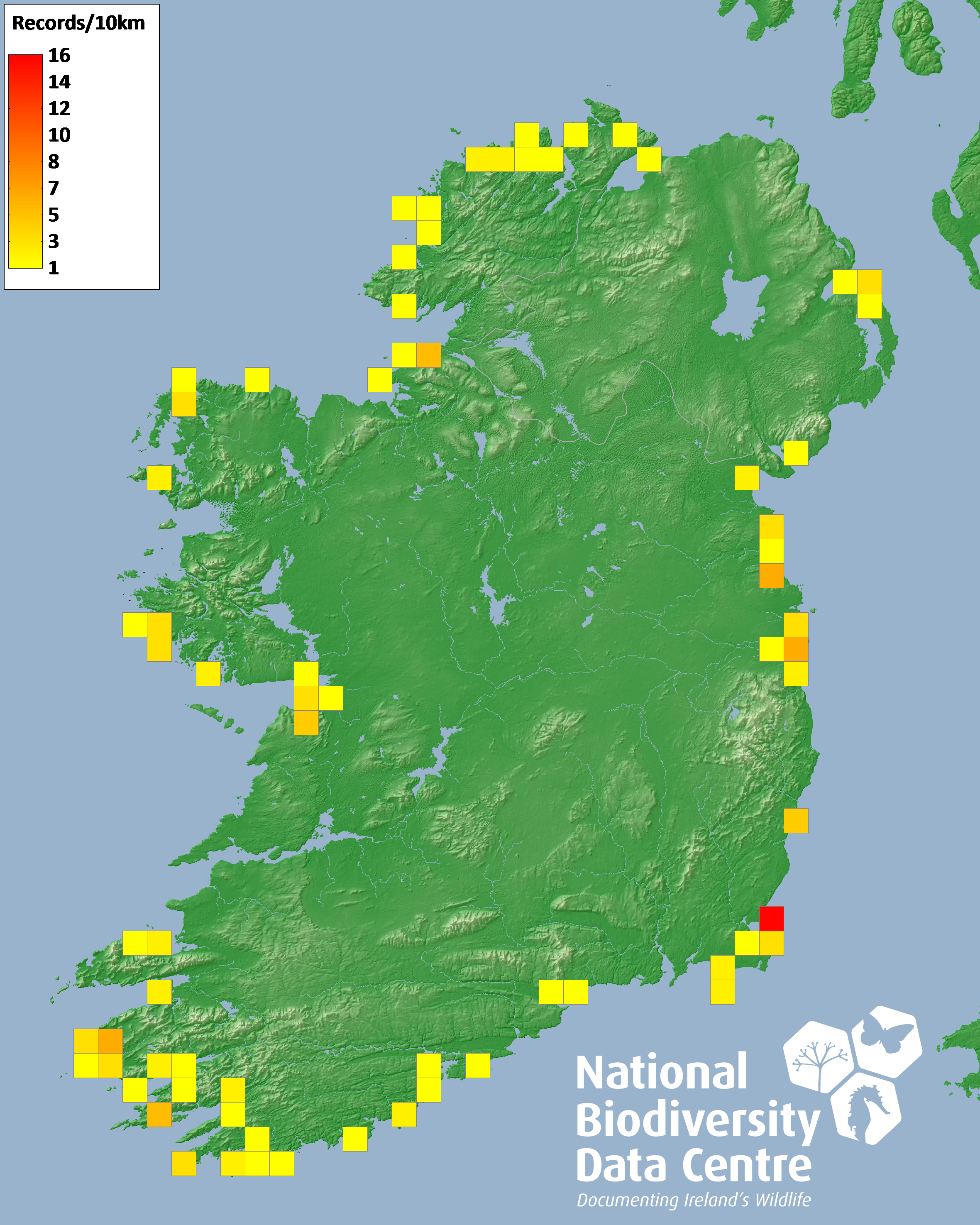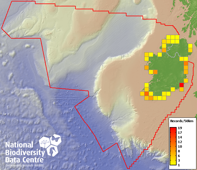 Distribution of the number of records recorded within each 10km grid square (ITM).Marine Map - 50km