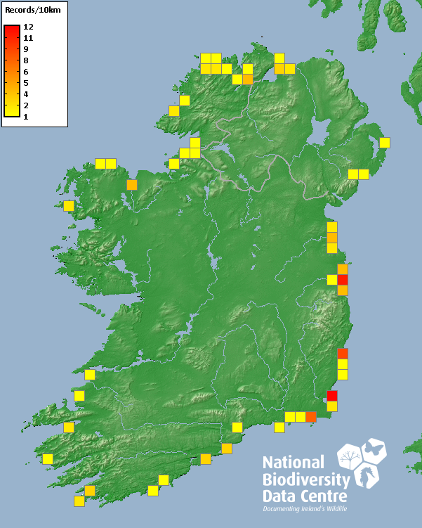 Distribution of the number of records recorded within each 10km grid square (ITM).Marine Map - 50km