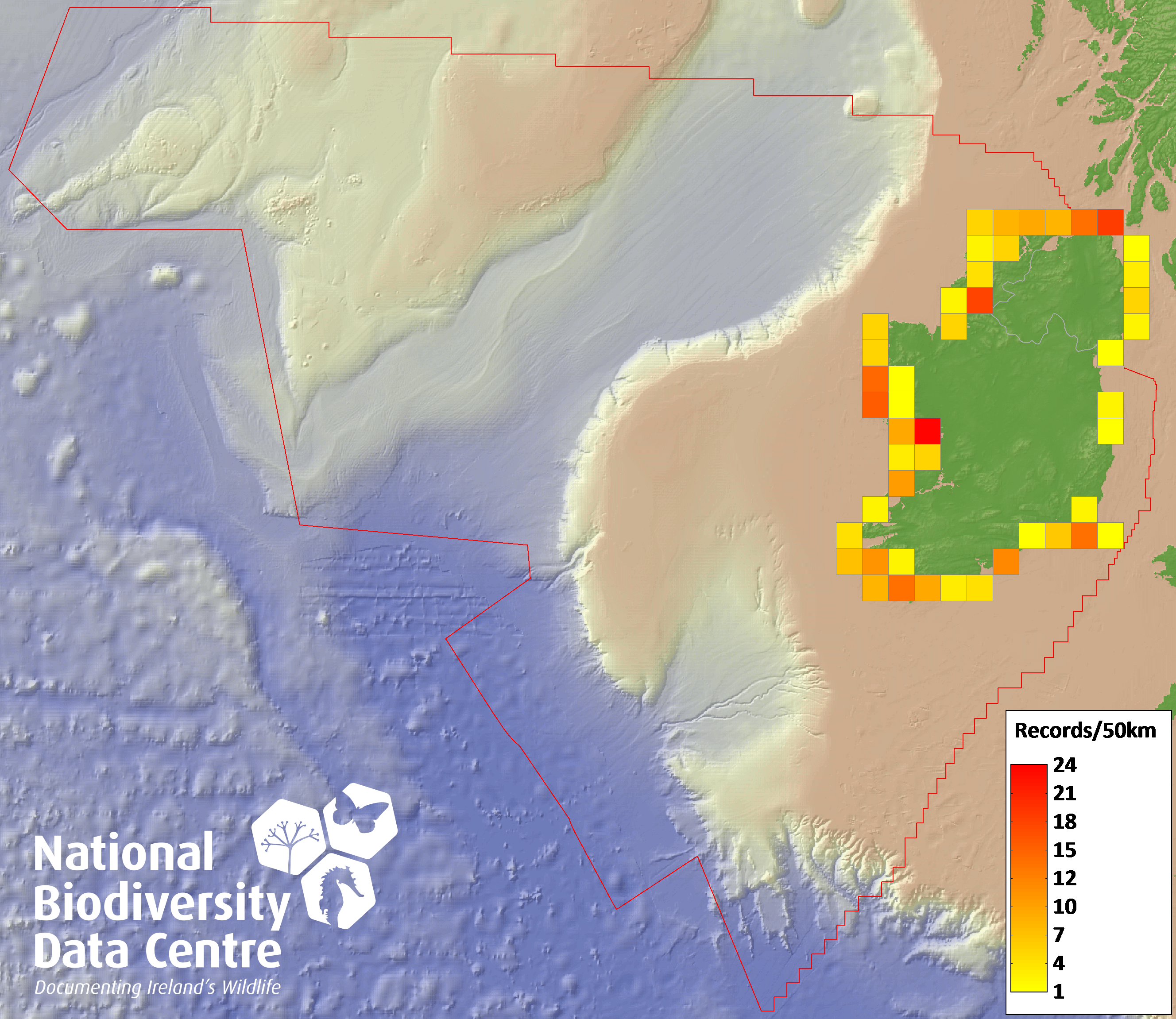 Distribution of the number of records recorded within each 10km grid square (ITM).Marine Map - 50km