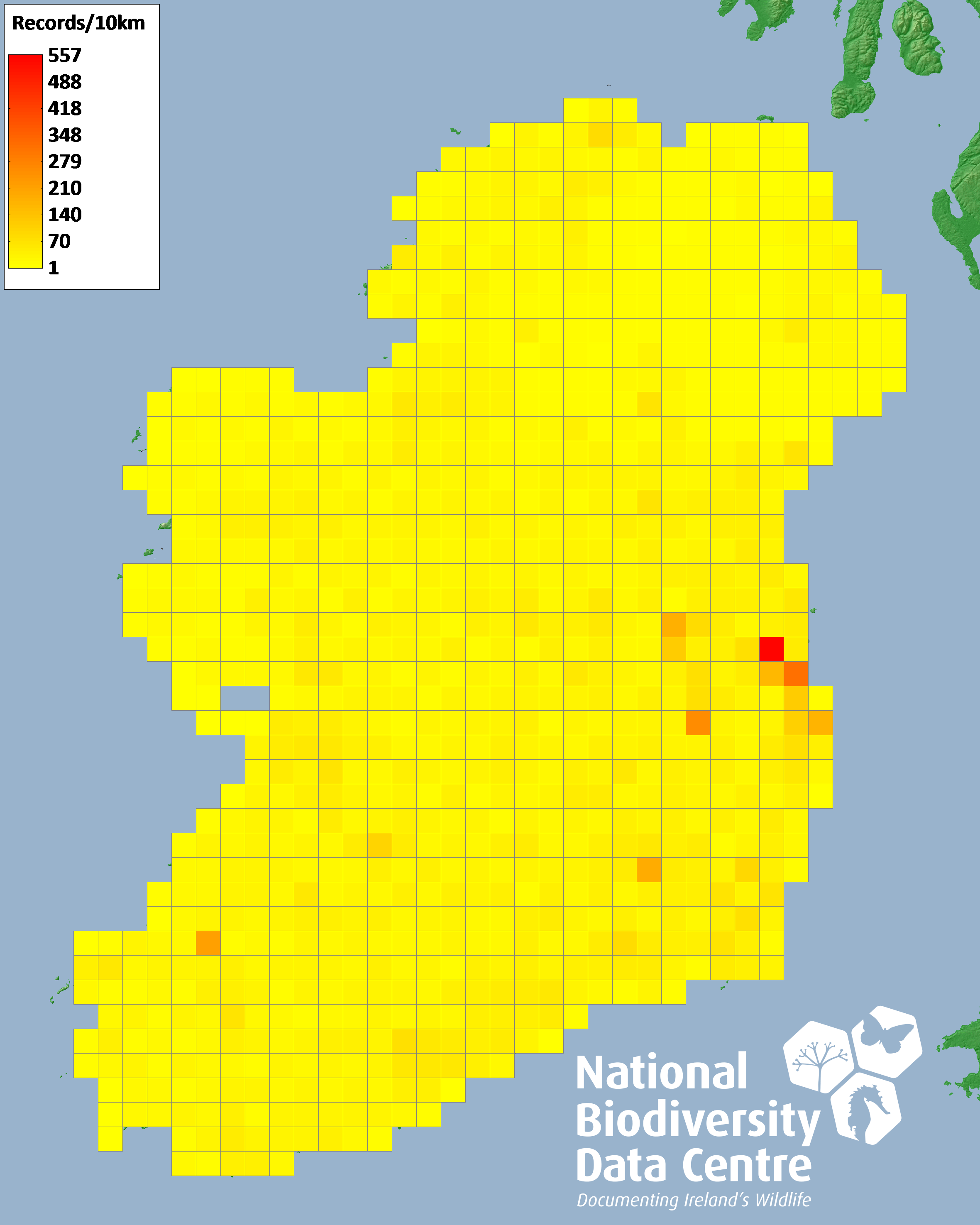 Distribution of the number of records recorded within each 10km grid square (ITM).Marine Map - 50km