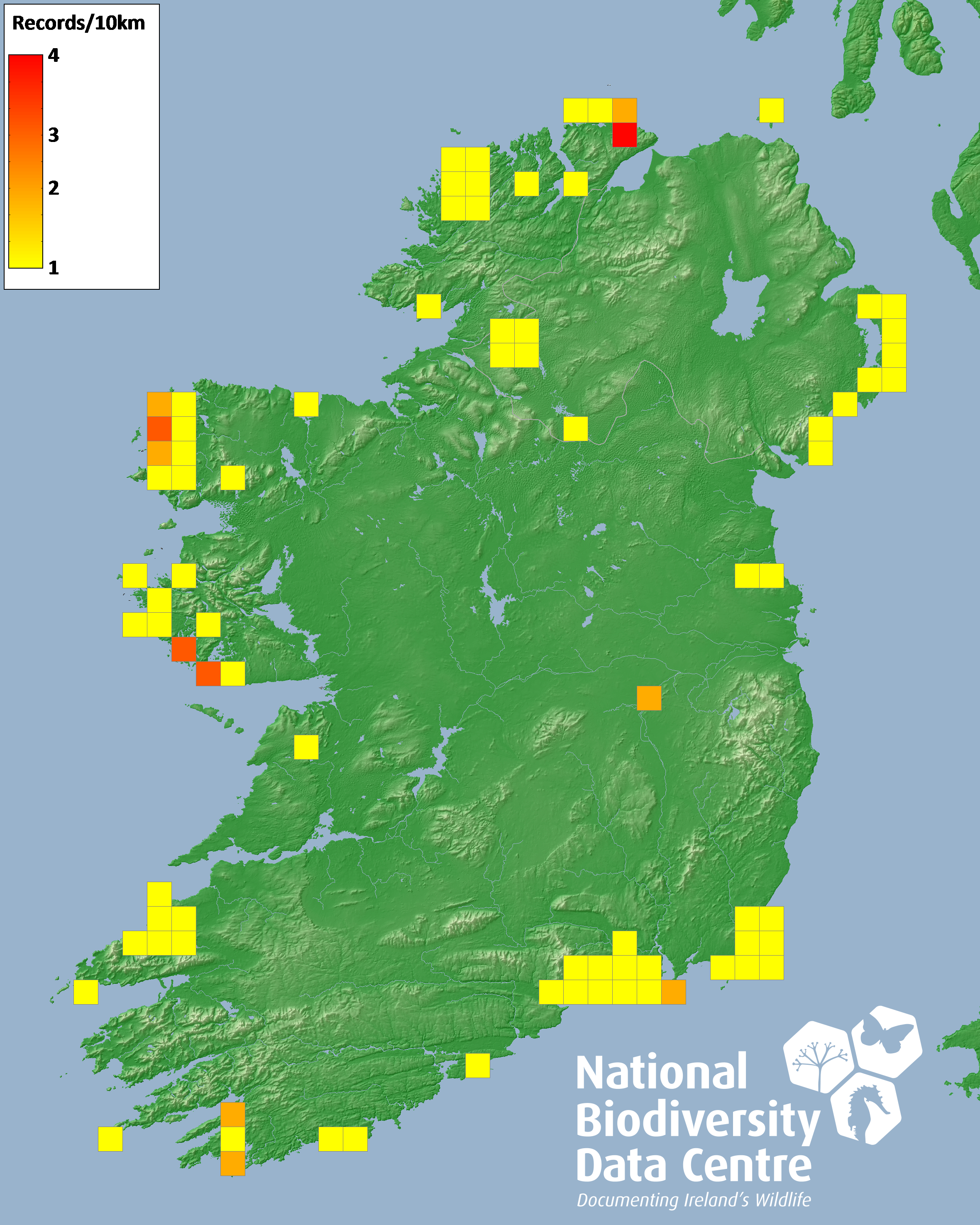 Distribution of the number of records recorded within each 10km grid square (ITM).Marine Map - 50km