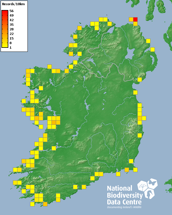 Distribution of the number of records recorded within each 10km grid square (ITM).Marine Map - 50km
