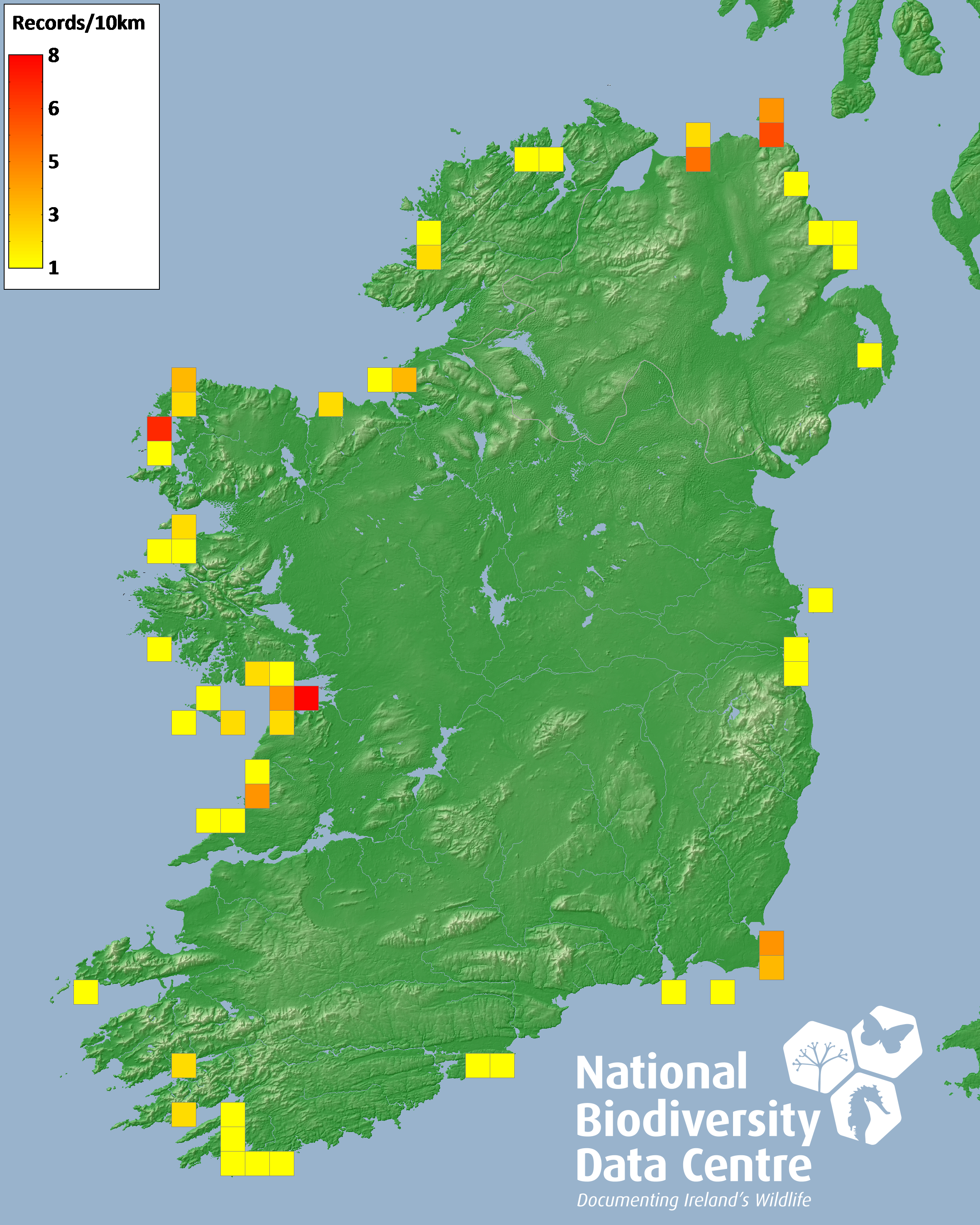 Distribution of the number of records recorded within each 10km grid square (ITM).Marine Map - 50km
