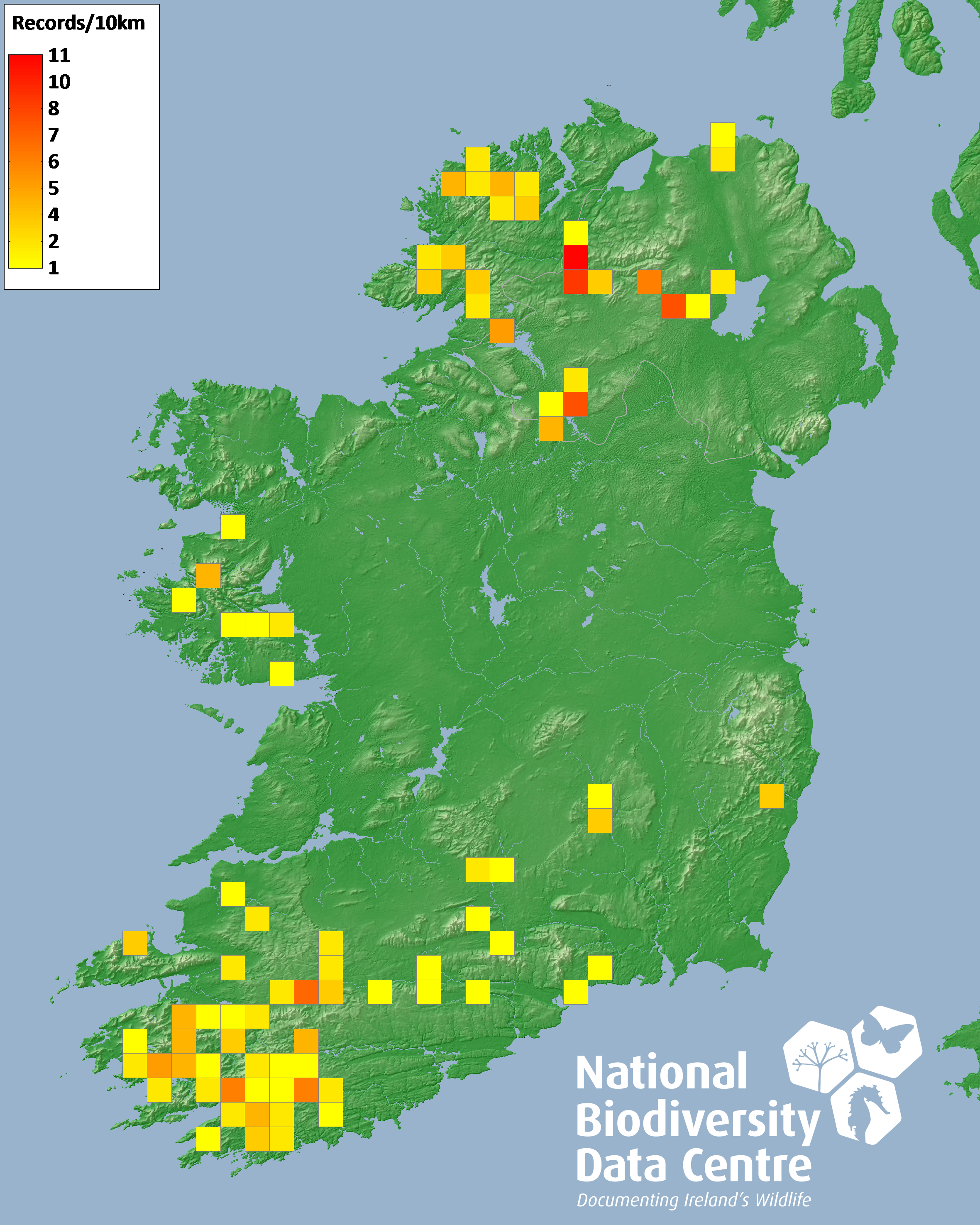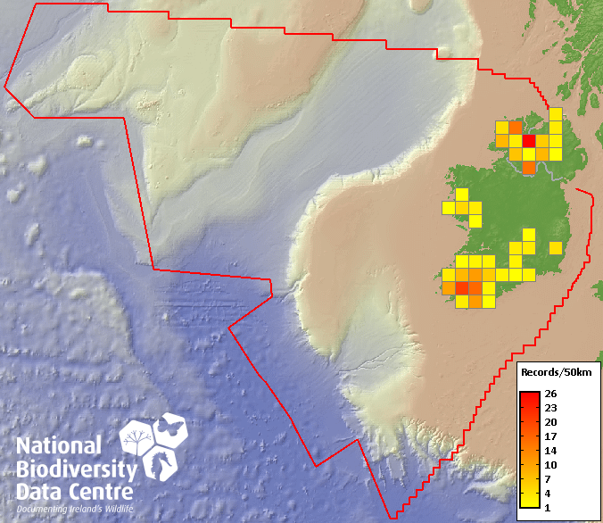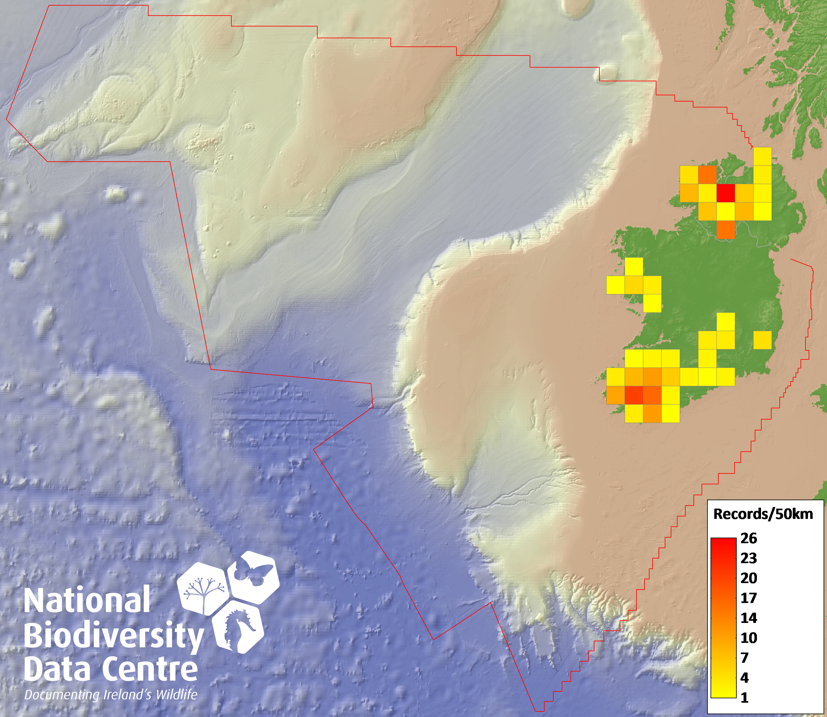 Distribution of the number of records recorded within each 10km grid square (ITM).Marine Map - 50km