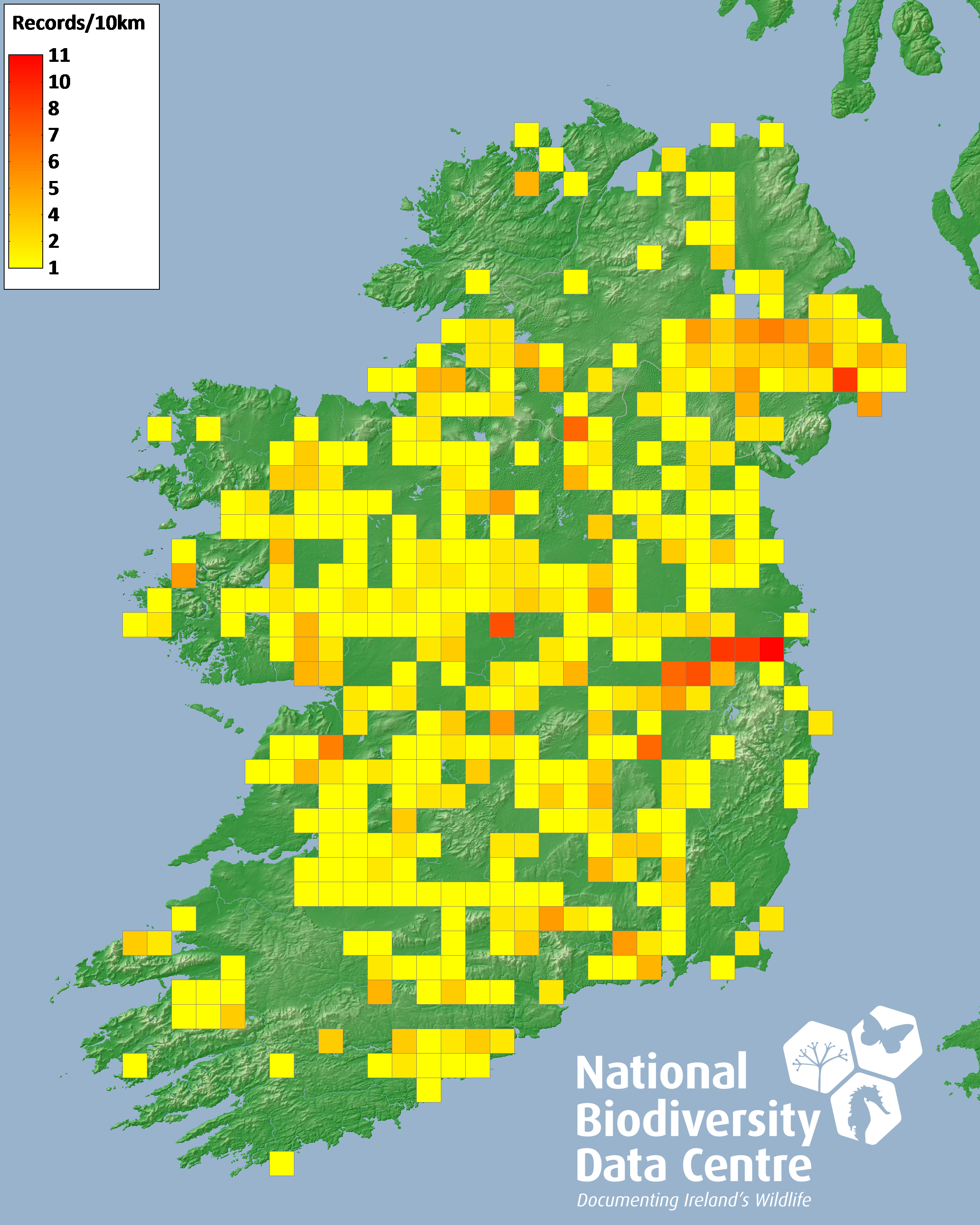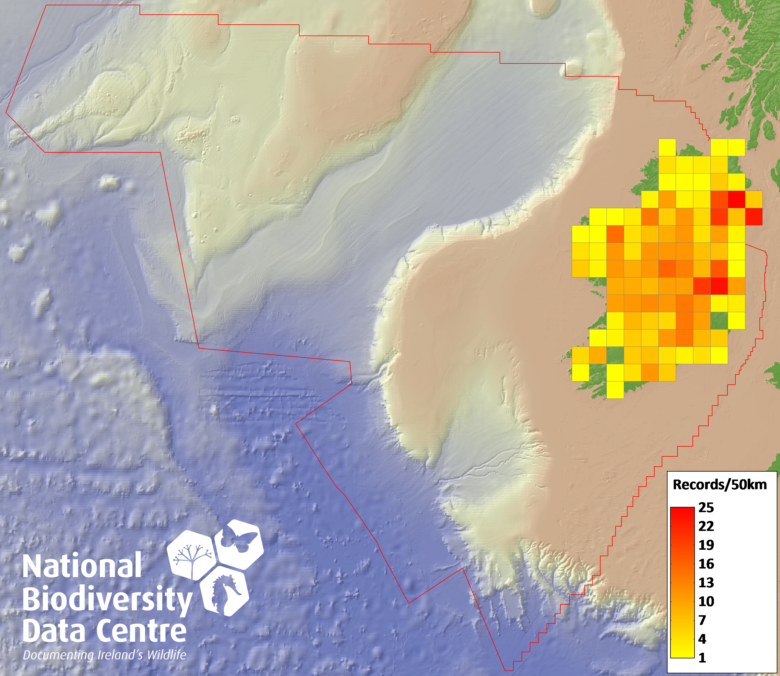 Distribution of the number of records recorded within each 10km grid square (ITM).Marine Map - 50km