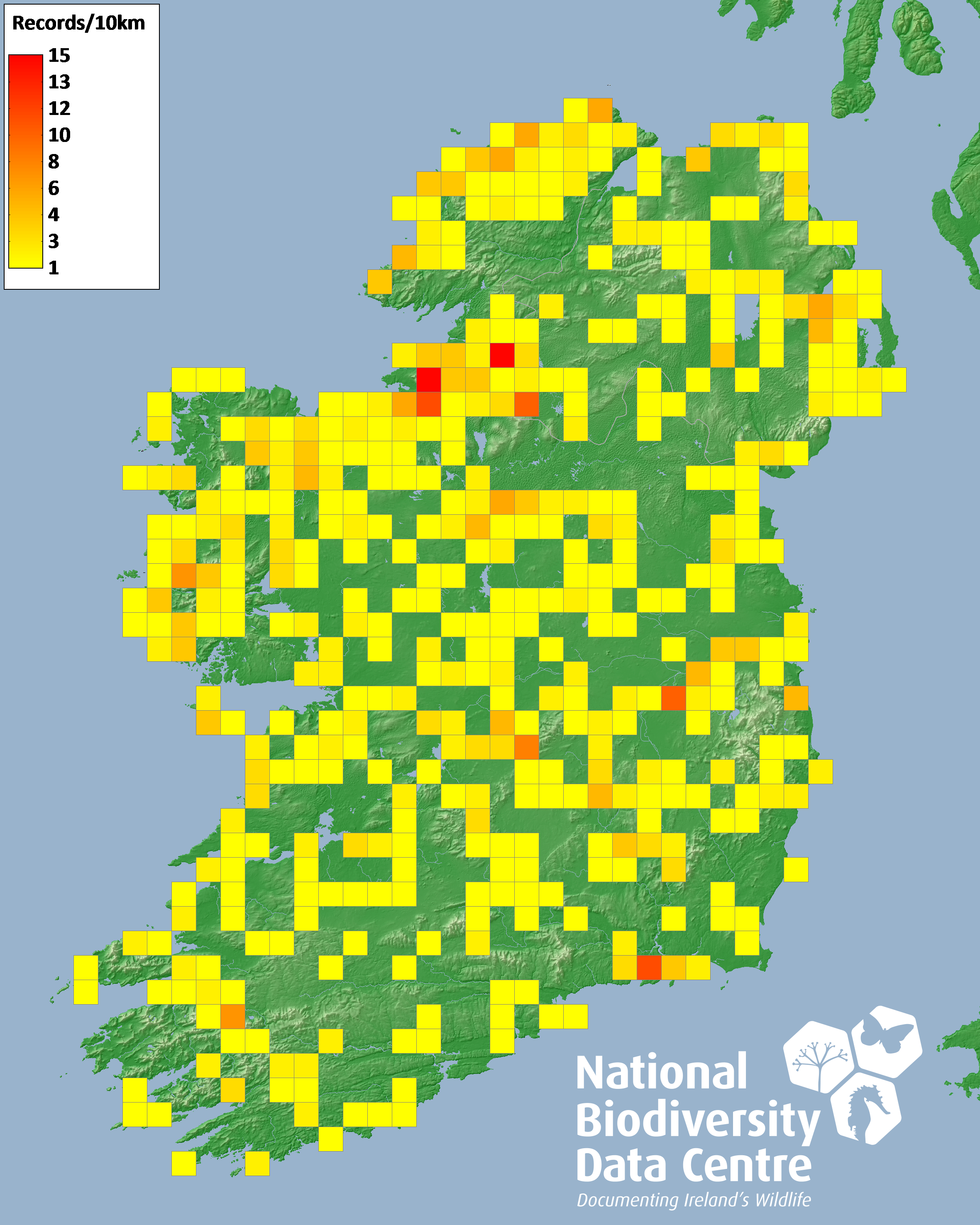 Distribution of the number of records recorded within each 10km grid square (ITM).Marine Map - 50km