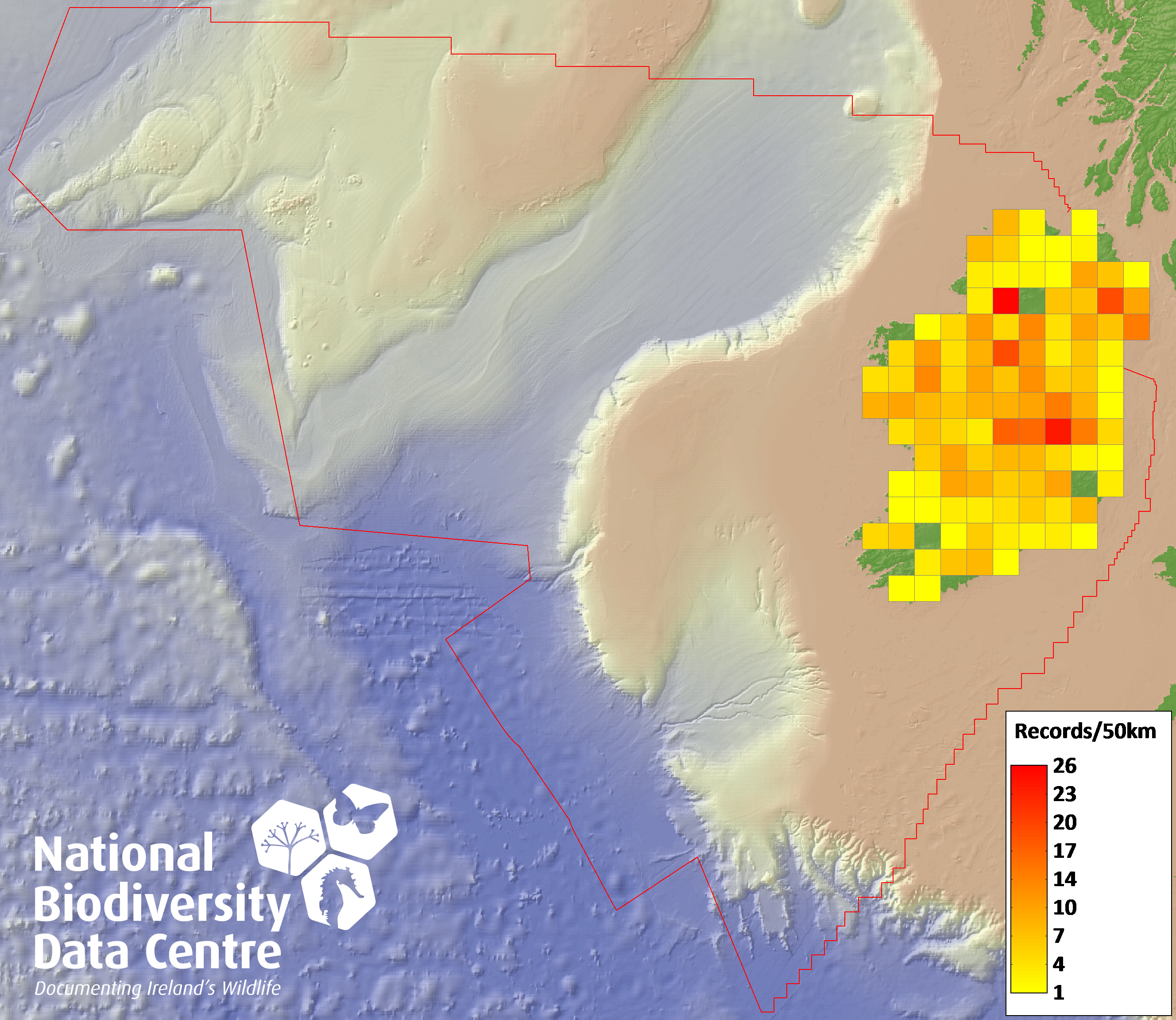 Distribution of the number of records recorded within each 10km grid square (ITM).Marine Map - 50km