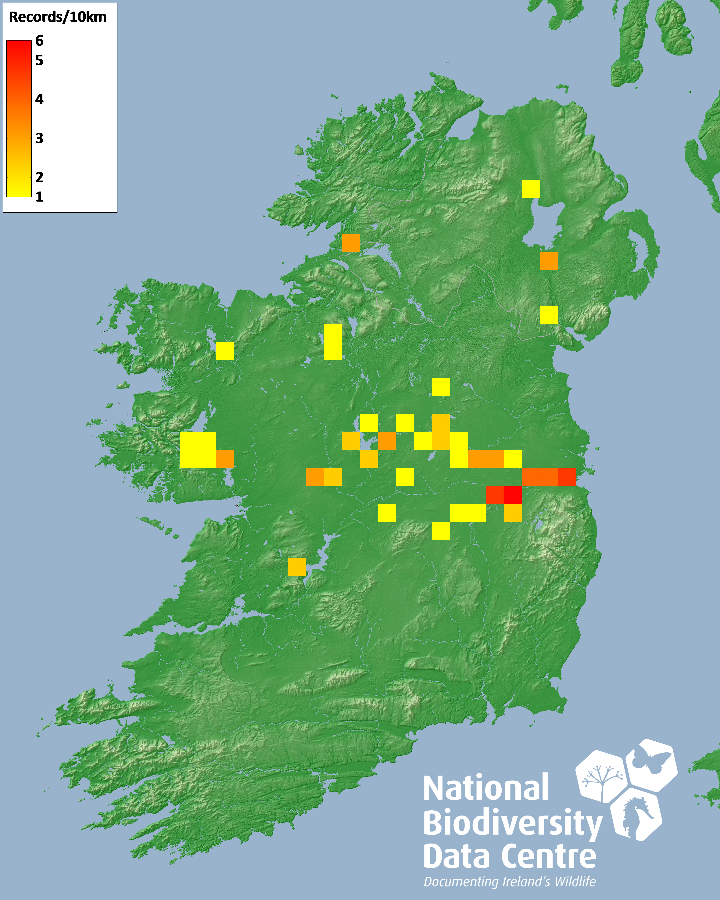 Distribution of the number of records recorded within each 10km grid square (ITM).Marine Map - 50km