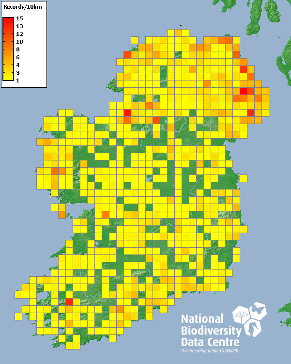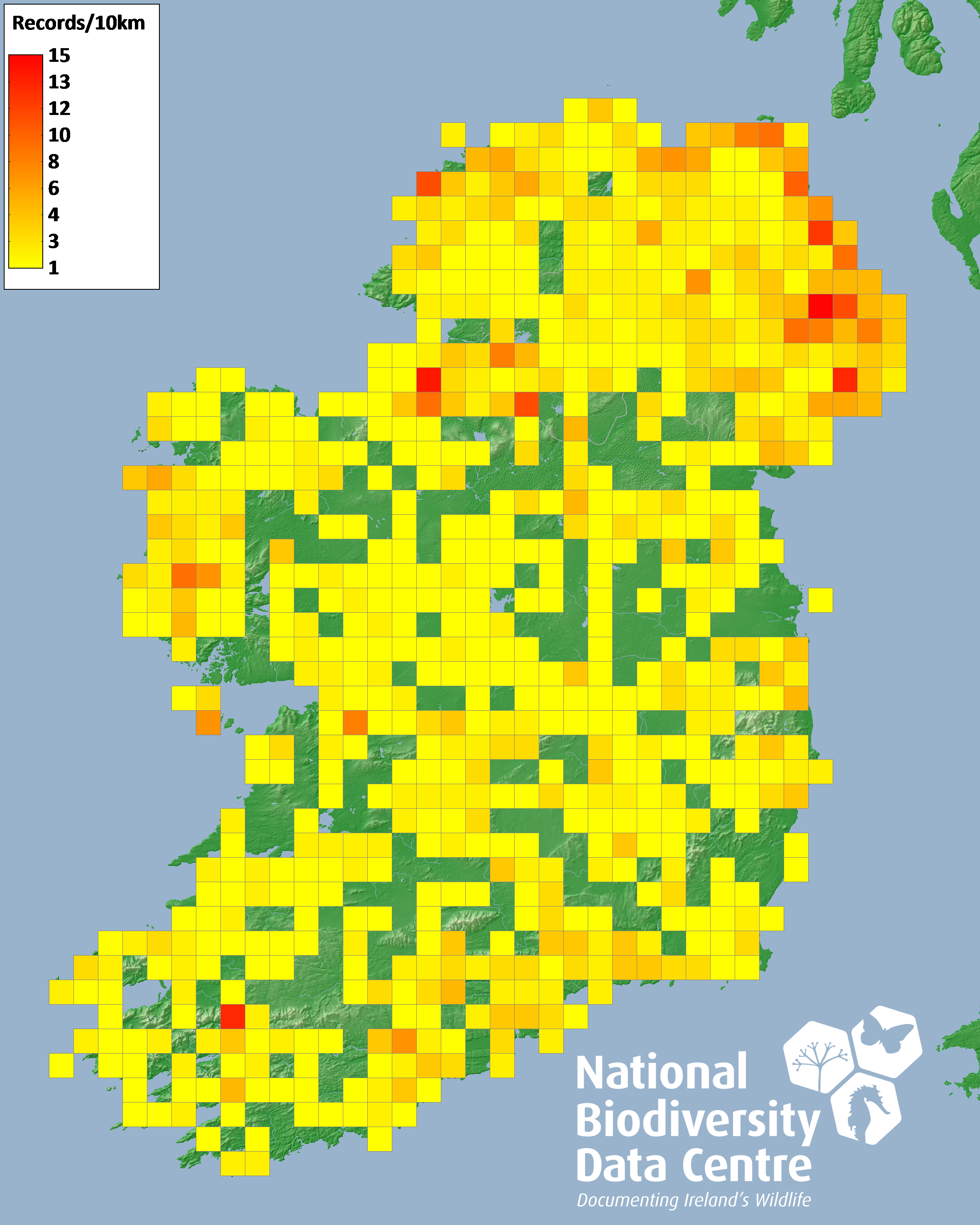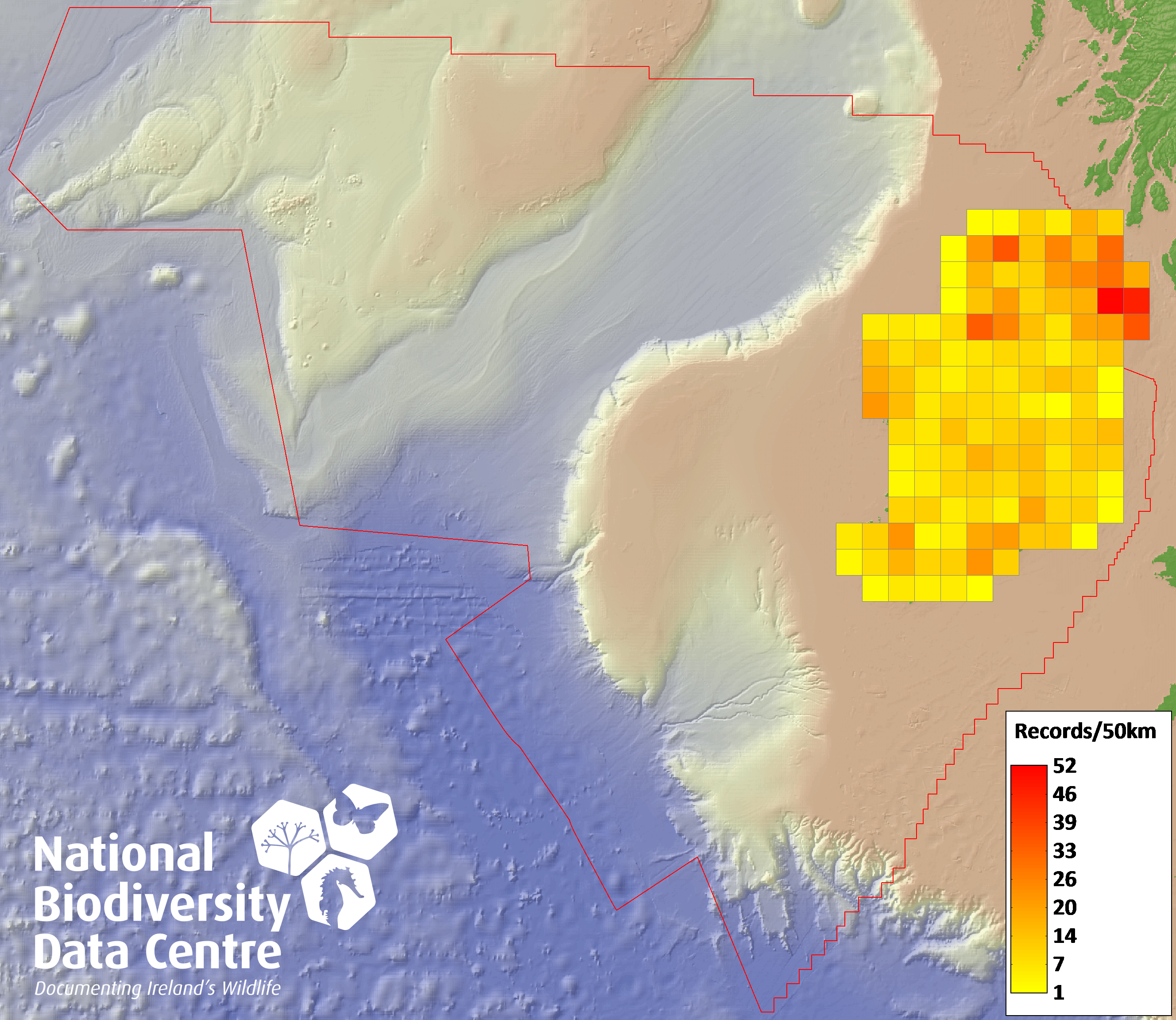 Distribution of the number of records recorded within each 10km grid square (ITM).Marine Map - 50km
