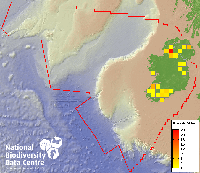 Distribution of the number of records recorded within each 10km grid square (ITM).Marine Map - 50km
