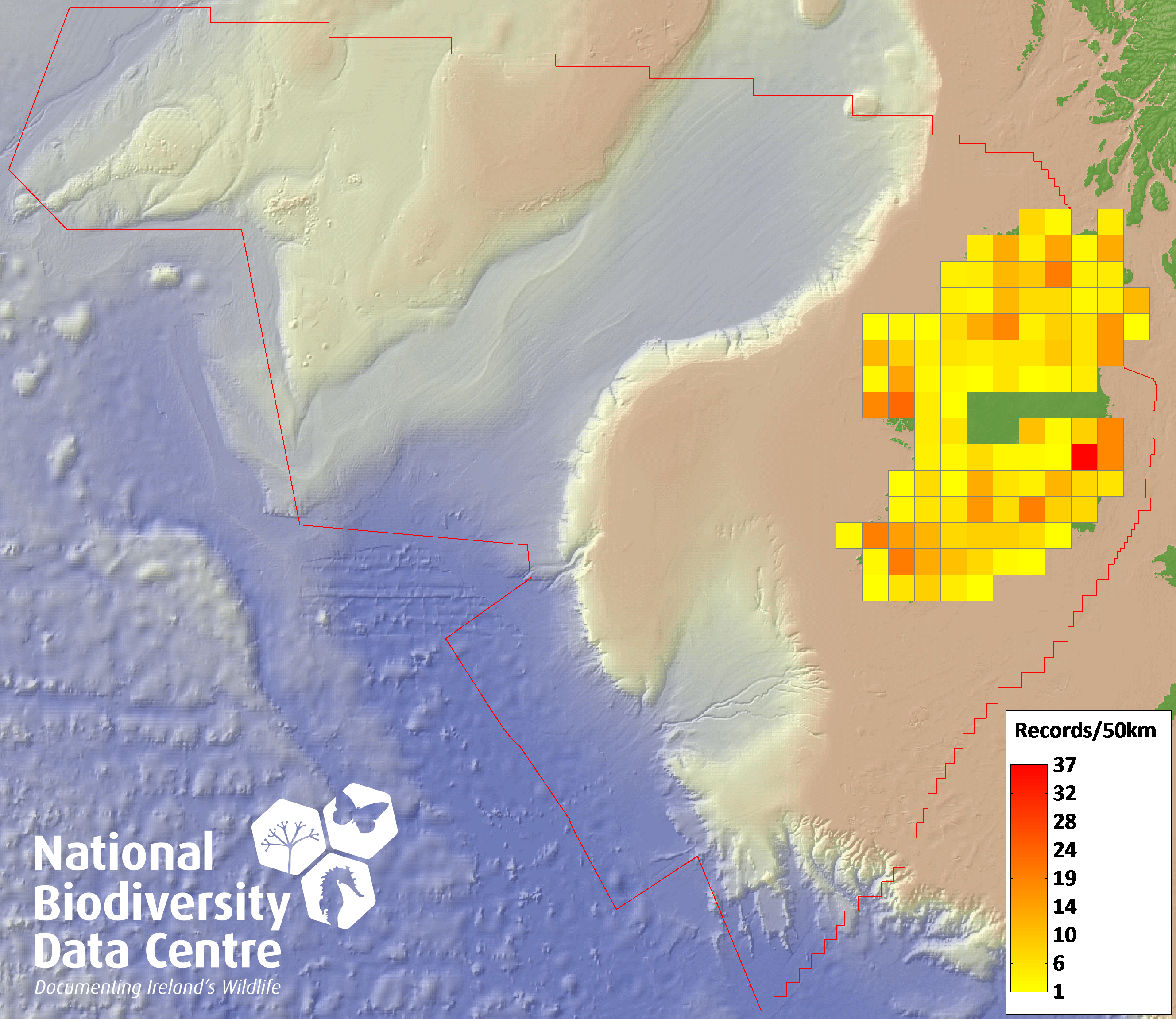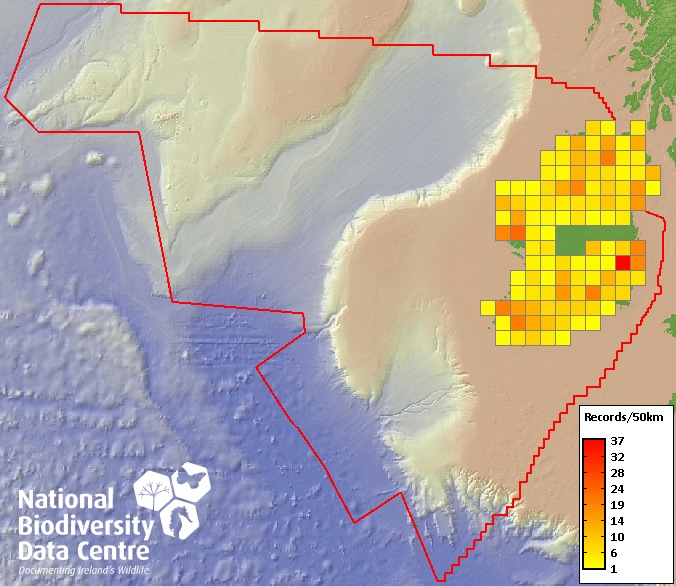 Distribution of the number of records recorded within each 10km grid square (ITM).Marine Map - 50km