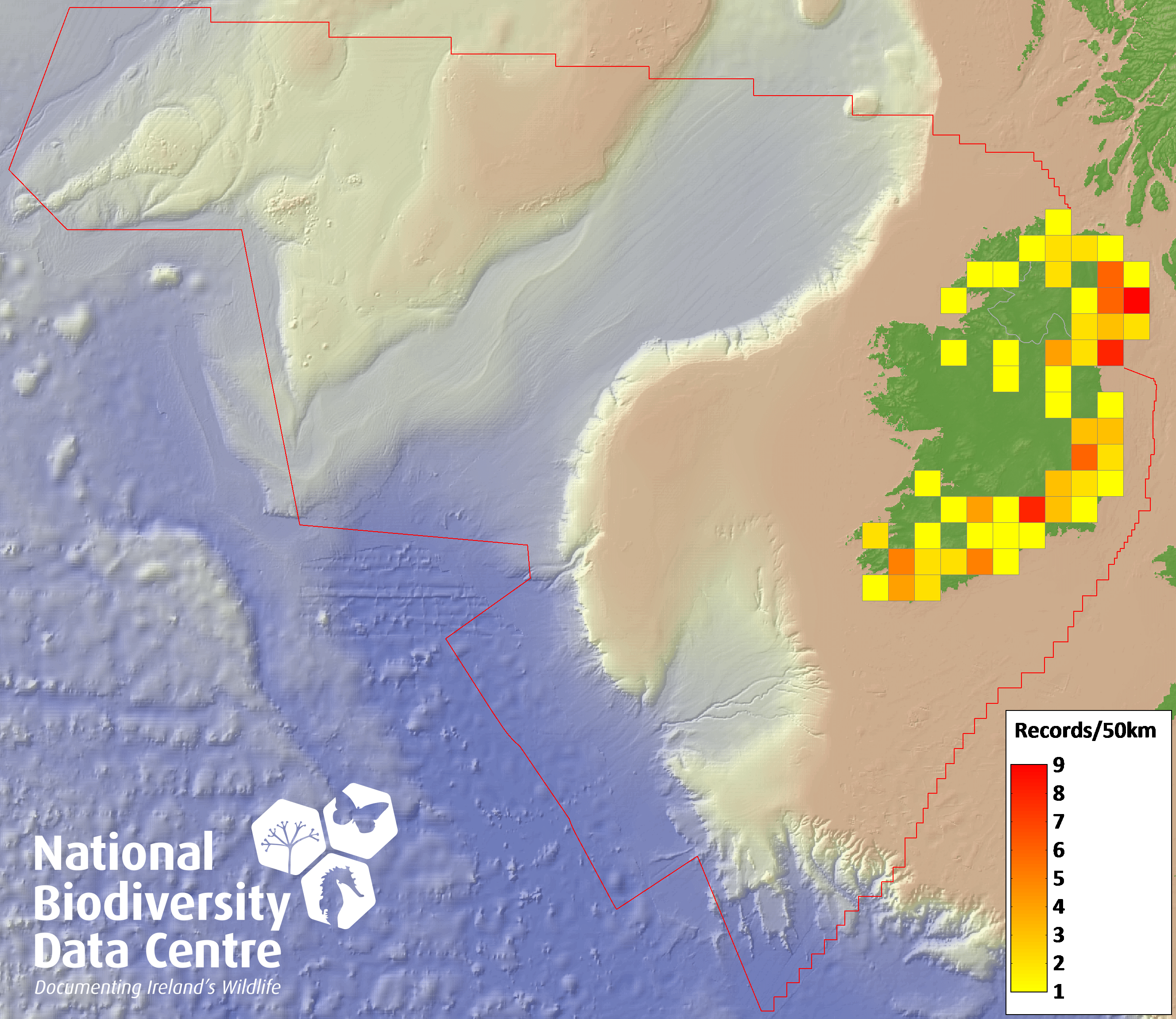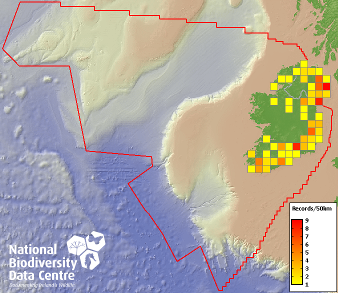 Distribution of the number of records recorded within each 10km grid square (ITM).Marine Map - 50km