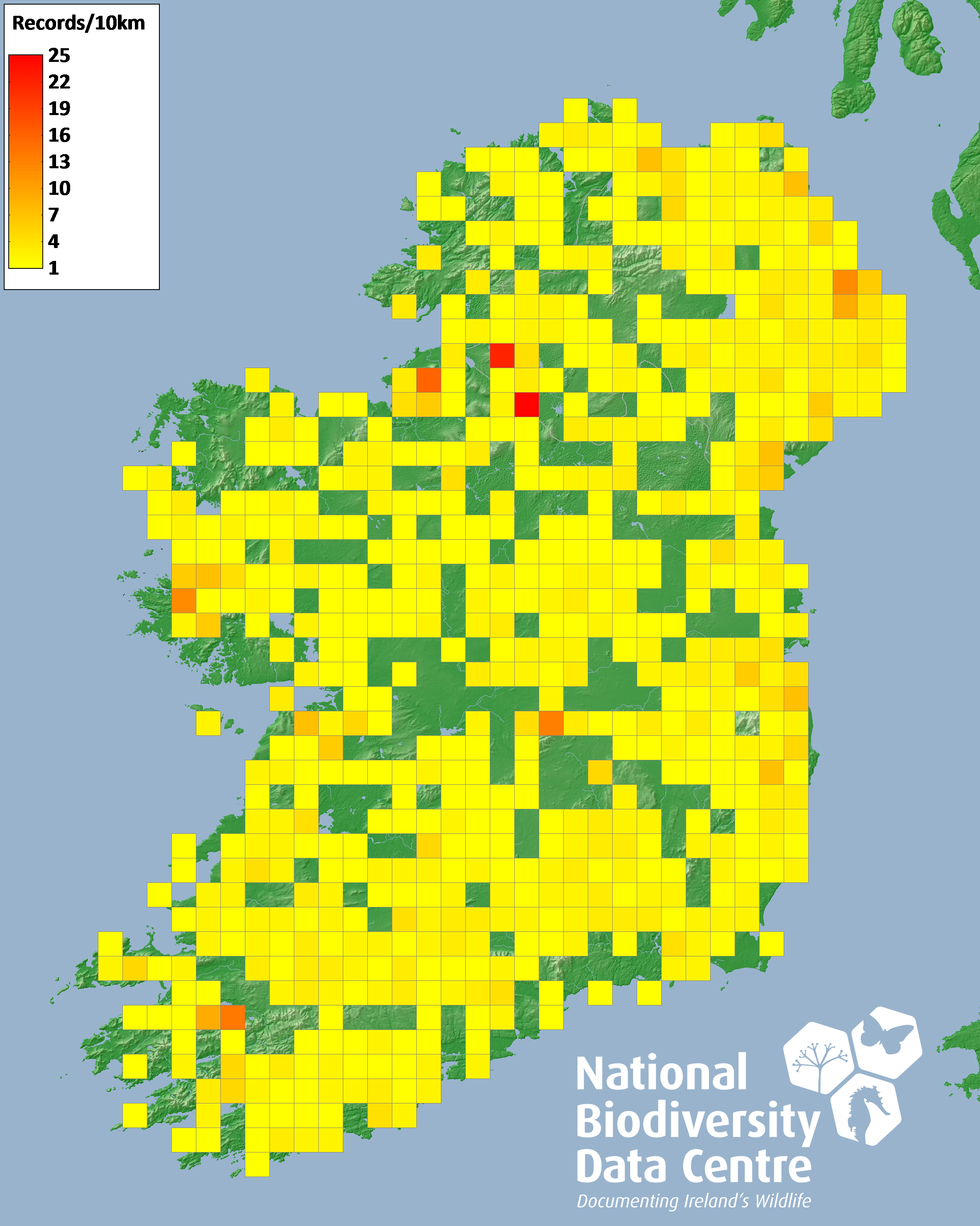 Distribution of the number of records recorded within each 10km grid square (ITM).Marine Map - 50km