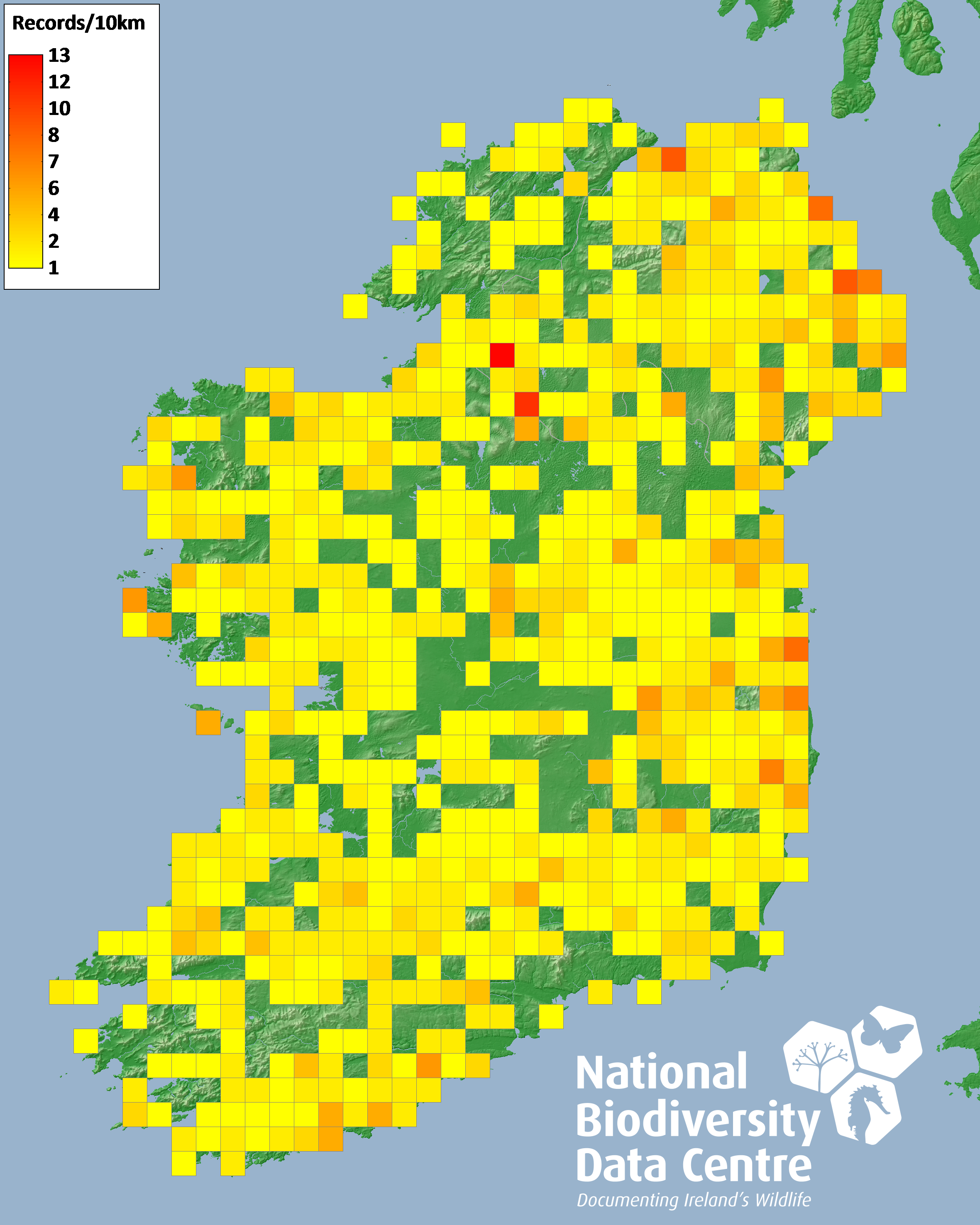 Distribution of the number of records recorded within each 10km grid square (ITM).Marine Map - 50km