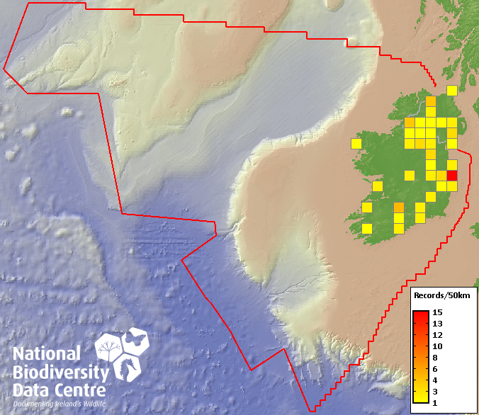 Distribution of the number of records recorded within each 10km grid square (ITM).Marine Map - 50km