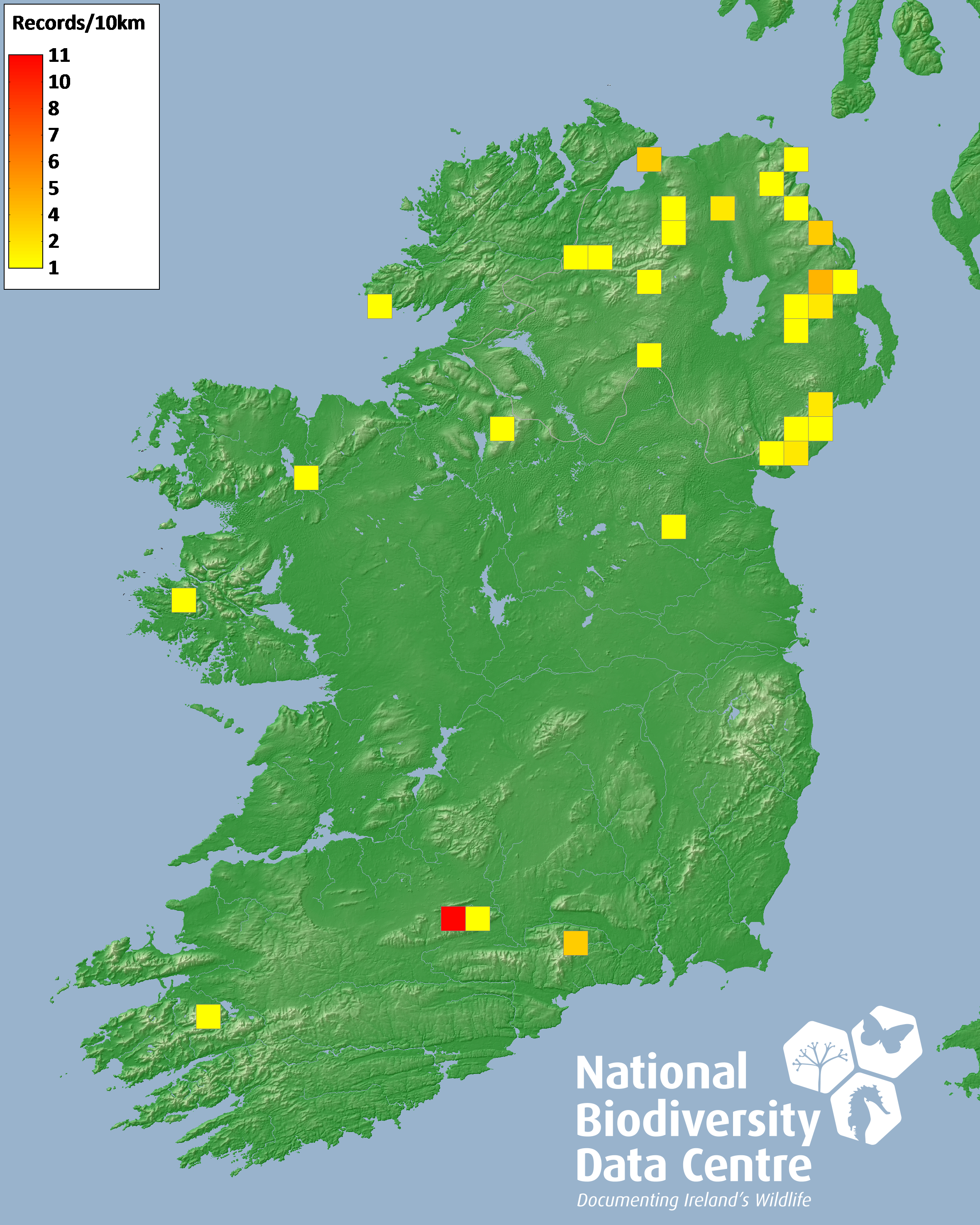 Distribution of the number of records recorded within each 10km grid square (ITM).Marine Map - 50km