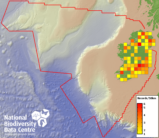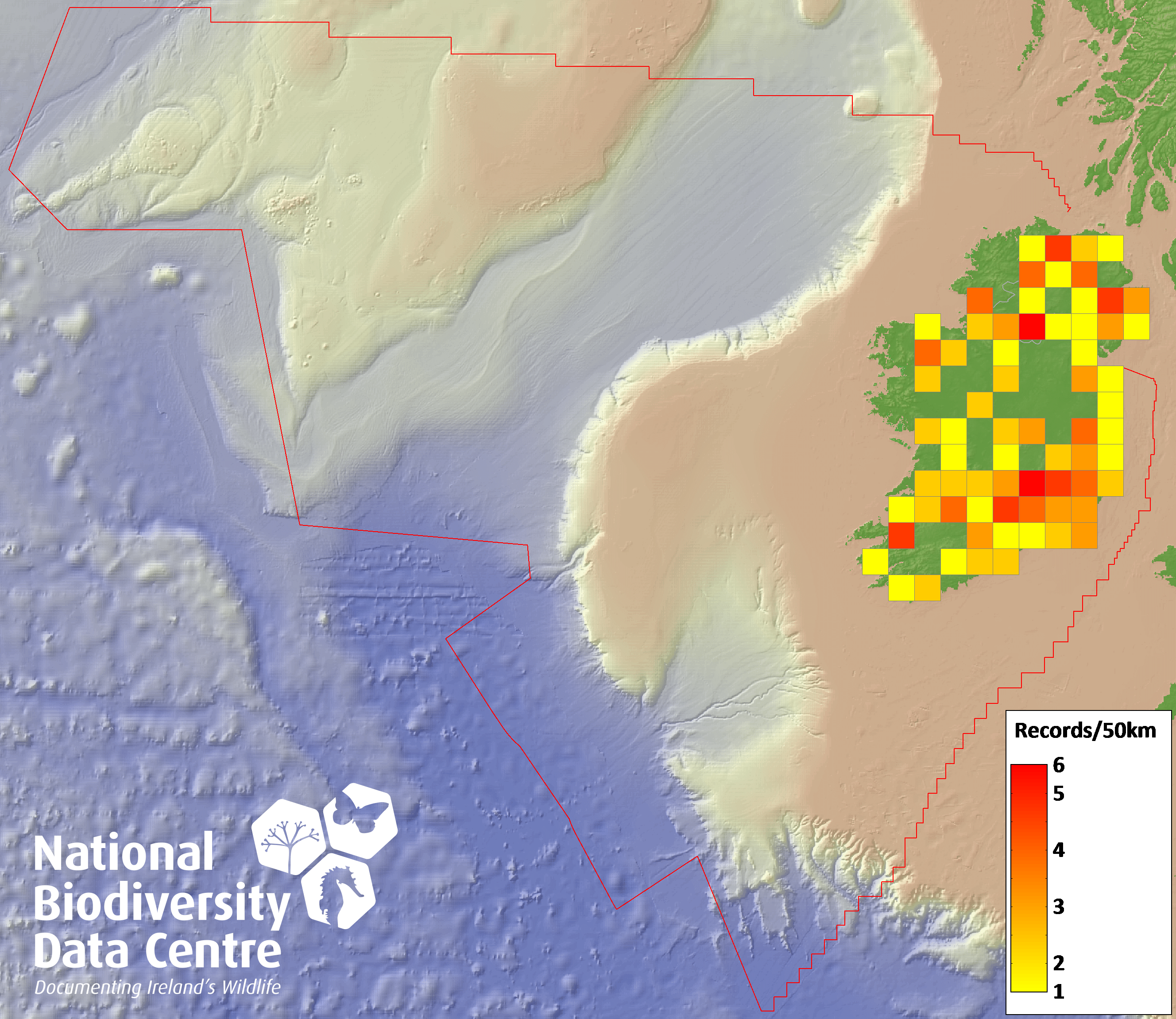 Distribution of the number of records recorded within each 10km grid square (ITM).Marine Map - 50km