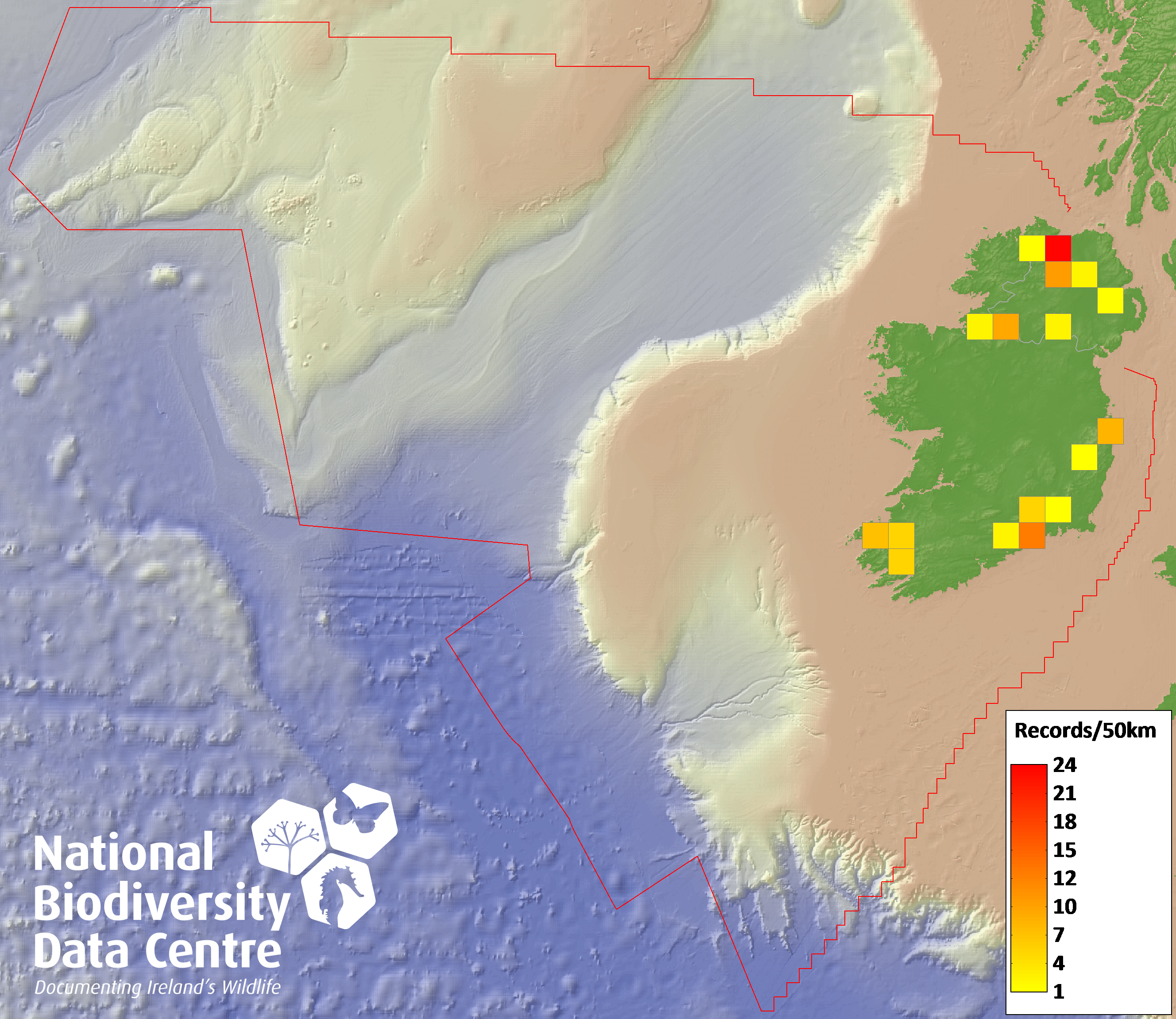 Distribution of the number of records recorded within each 10km grid square (ITM).Marine Map - 50km