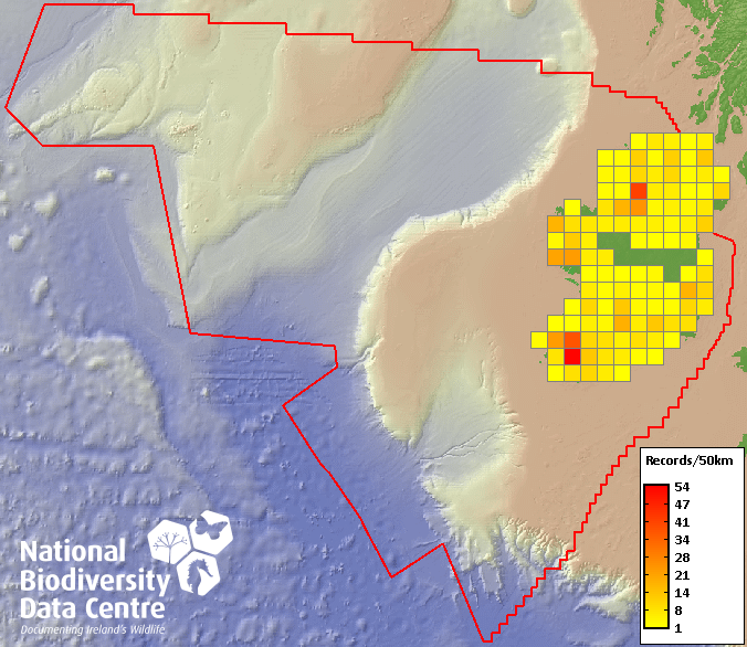 Distribution of the number of records recorded within each 10km grid square (ITM).Marine Map - 50km