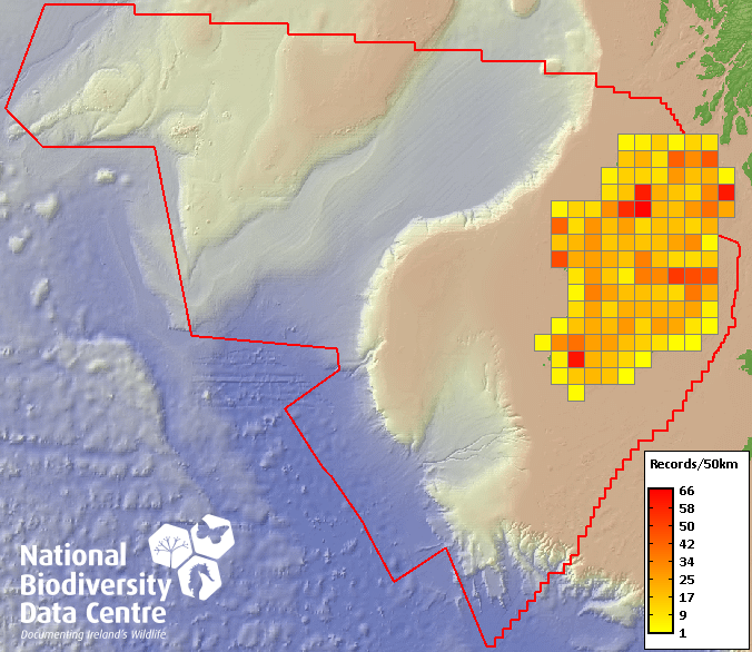 Distribution of the number of records recorded within each 10km grid square (ITM).Marine Map - 50km