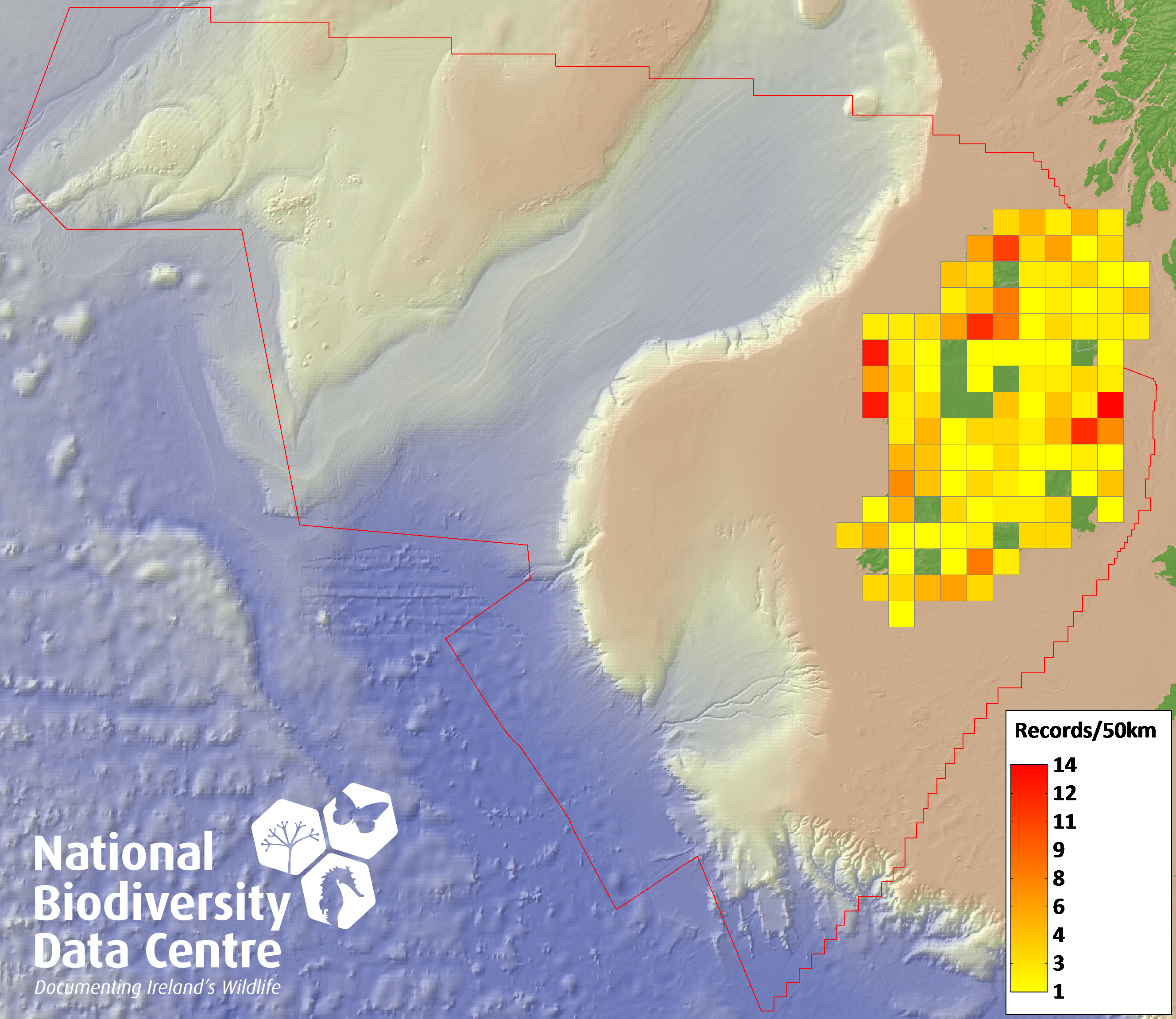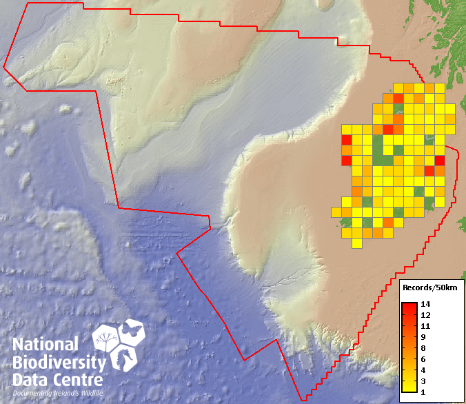 Distribution of the number of records recorded within each 10km grid square (ITM).Marine Map - 50km