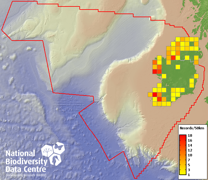 Distribution of the number of records recorded within each 10km grid square (ITM).Marine Map - 50km
