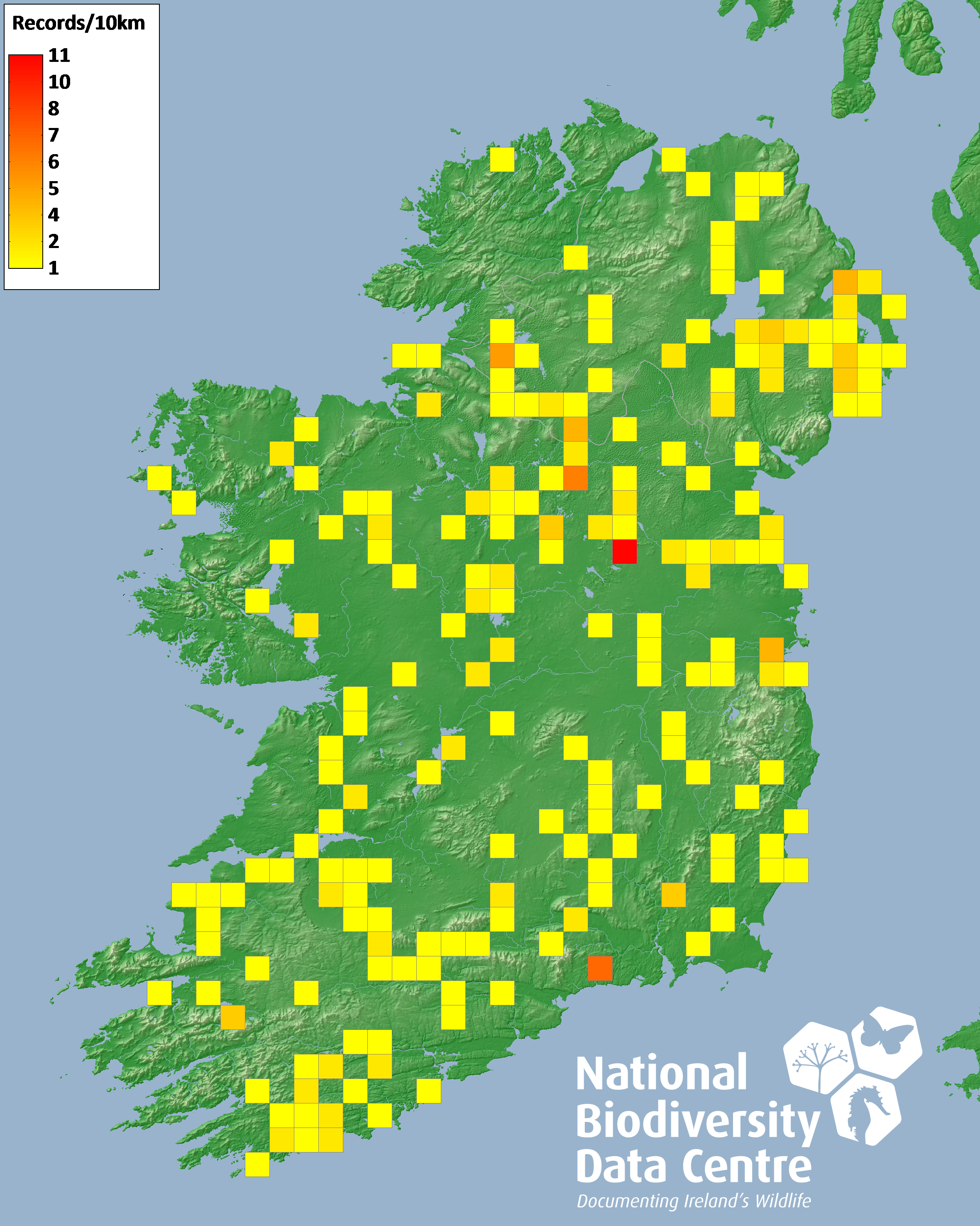 Distribution of the number of records recorded within each 10km grid square (ITM).Marine Map - 50km