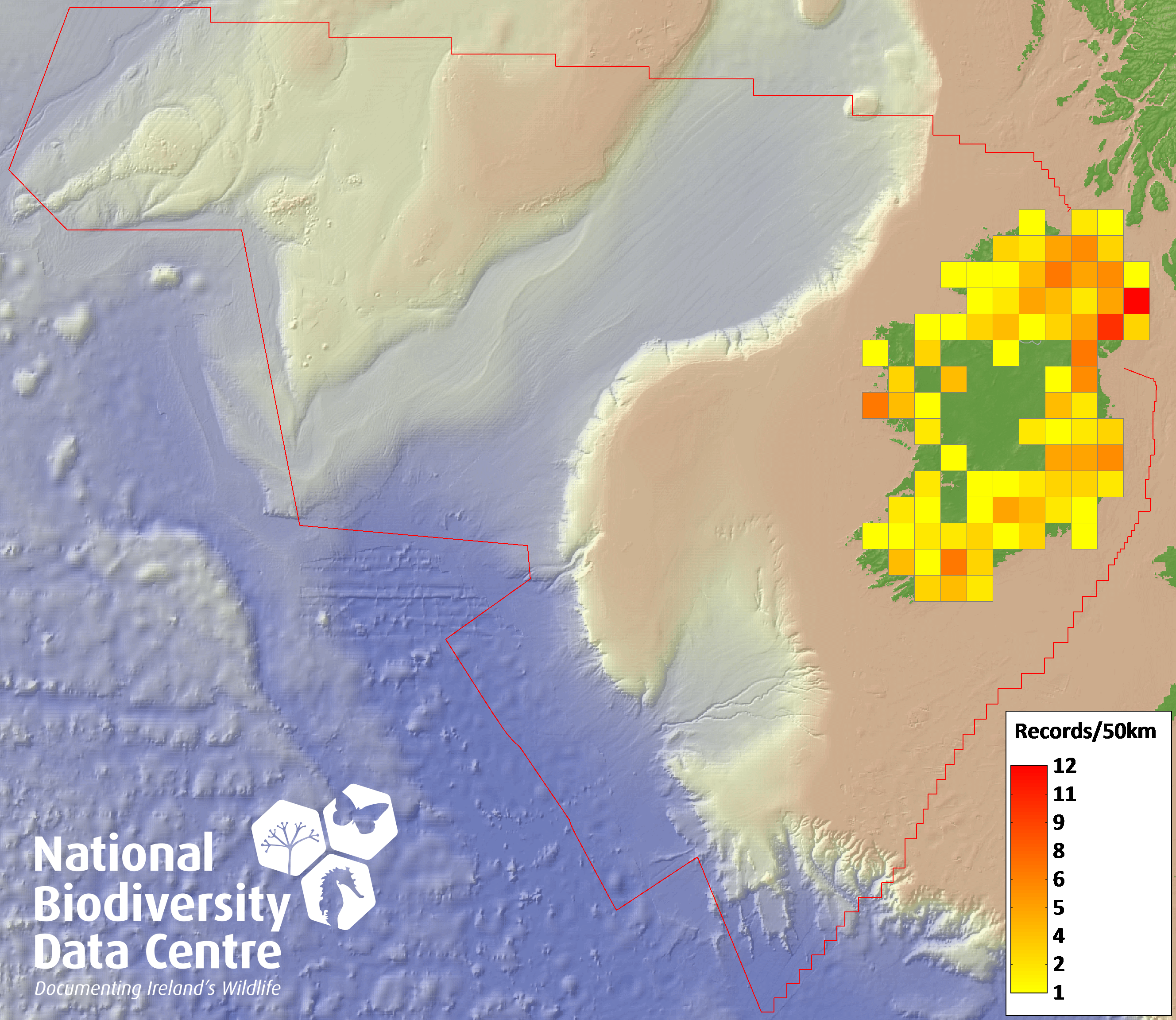Distribution of the number of records recorded within each 10km grid square (ITM).Marine Map - 50km