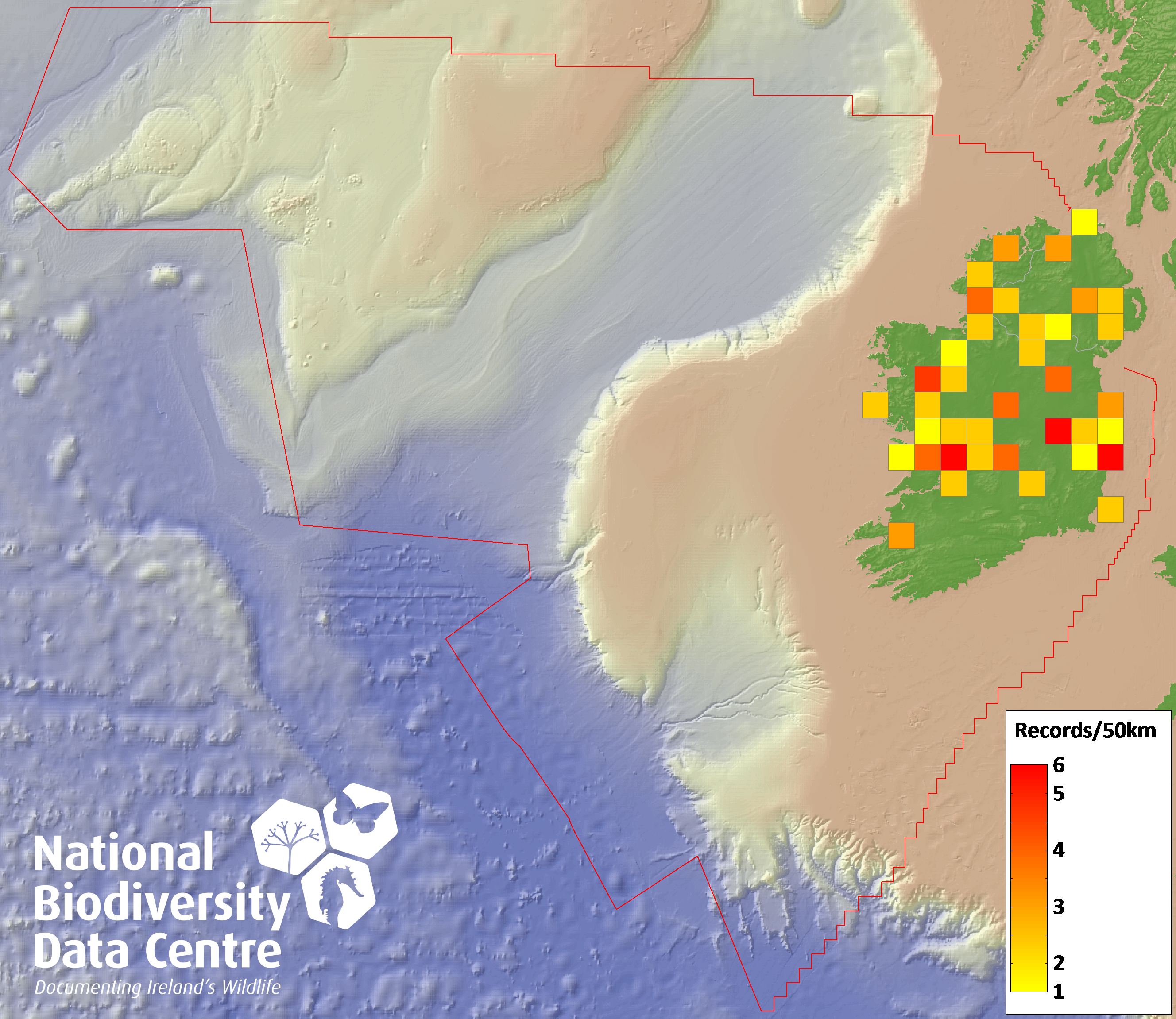 Distribution of the number of records recorded within each 10km grid square (ITM).Marine Map - 50km