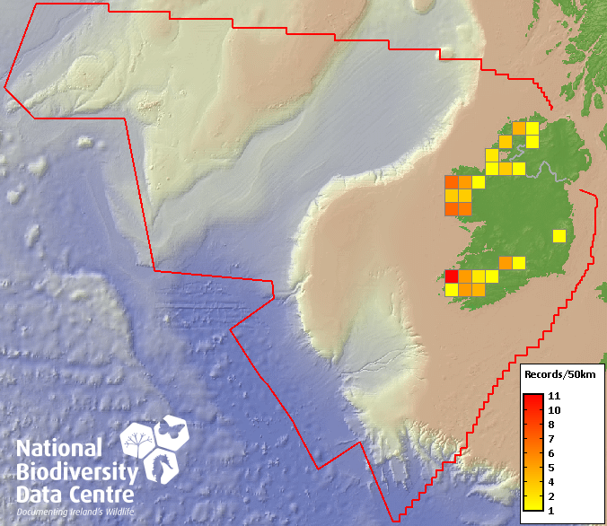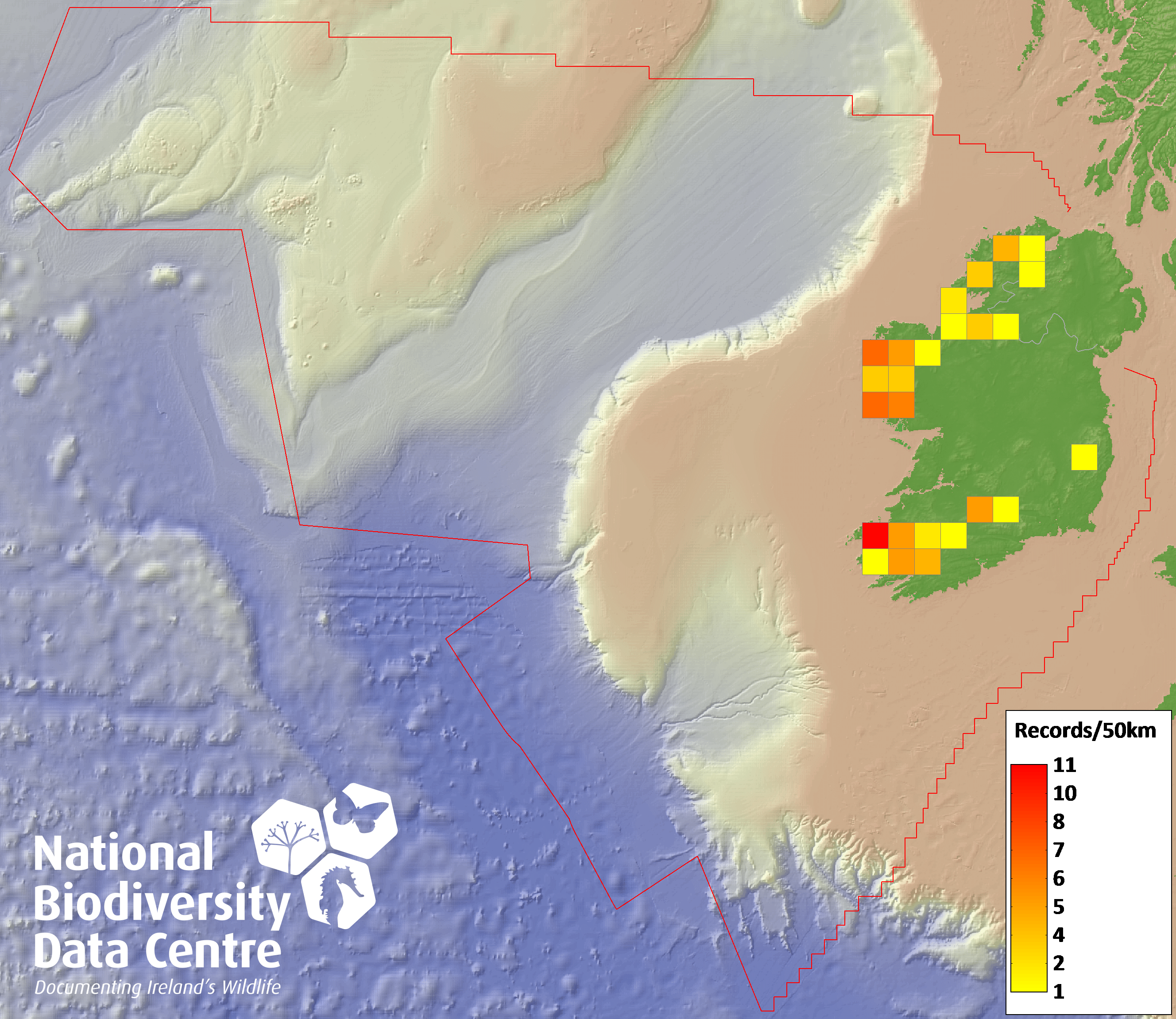 Distribution of the number of records recorded within each 10km grid square (ITM).Marine Map - 50km
