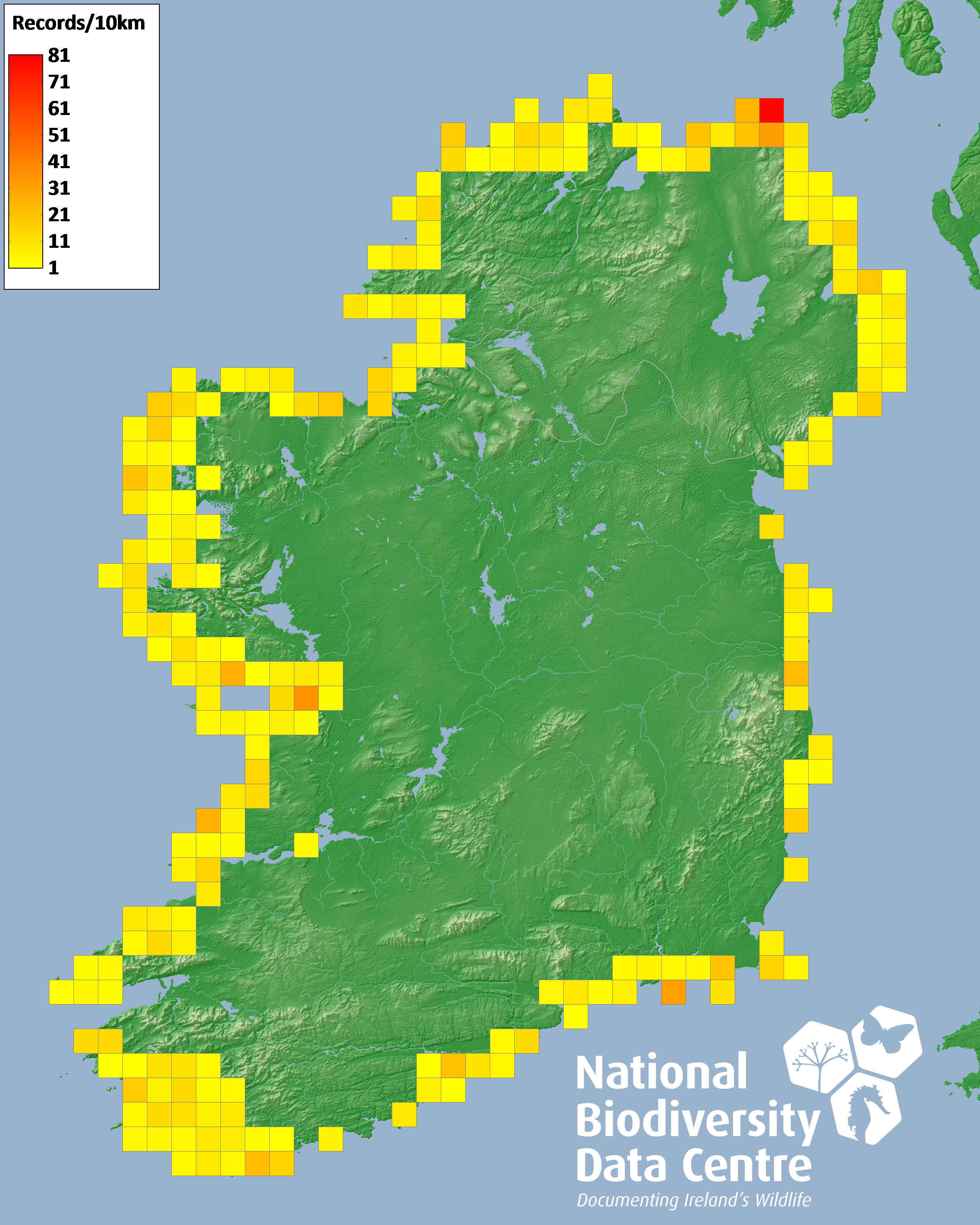 Distribution of the number of records recorded within each 10km grid square (ITM).Marine Map - 50km