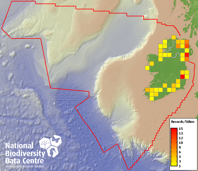 Distribution of the number of records recorded within each 10km grid square (ITM).Marine Map - 50km