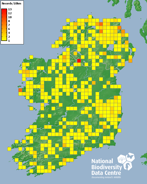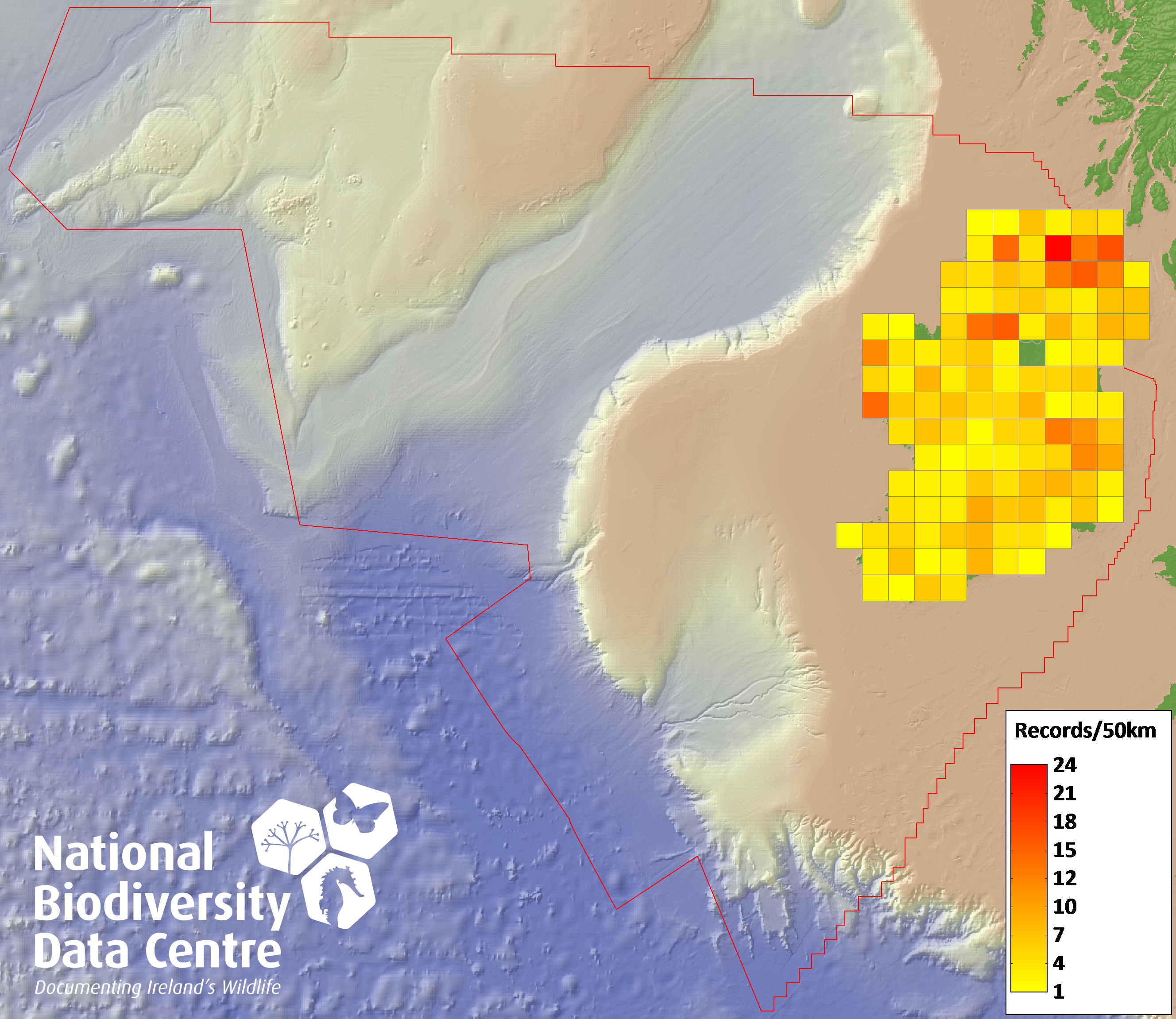 Distribution of the number of records recorded within each 10km grid square (ITM).Marine Map - 50km
