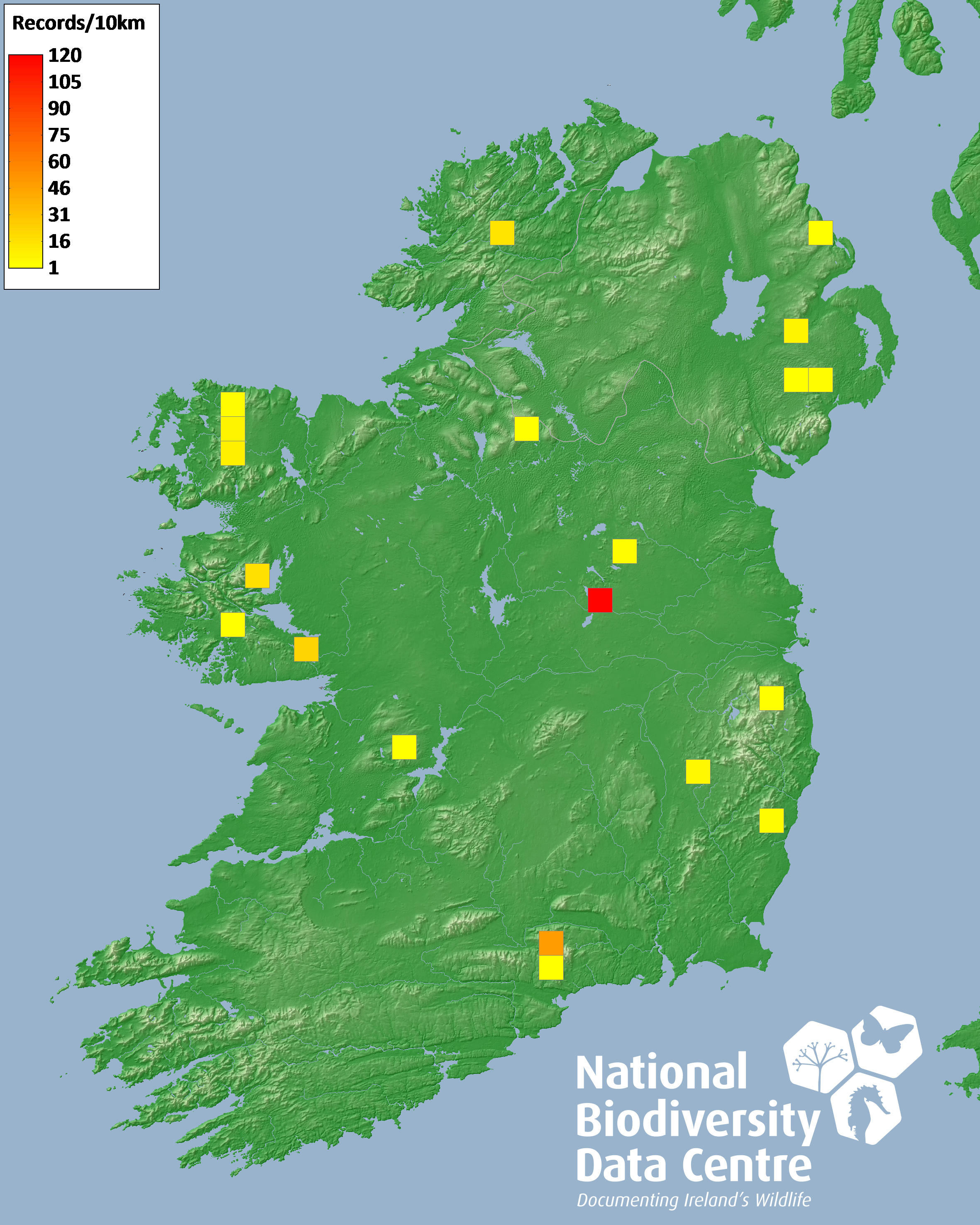 Distribution of the number of records recorded within each 10km grid square (ITM).Marine Map - 50km