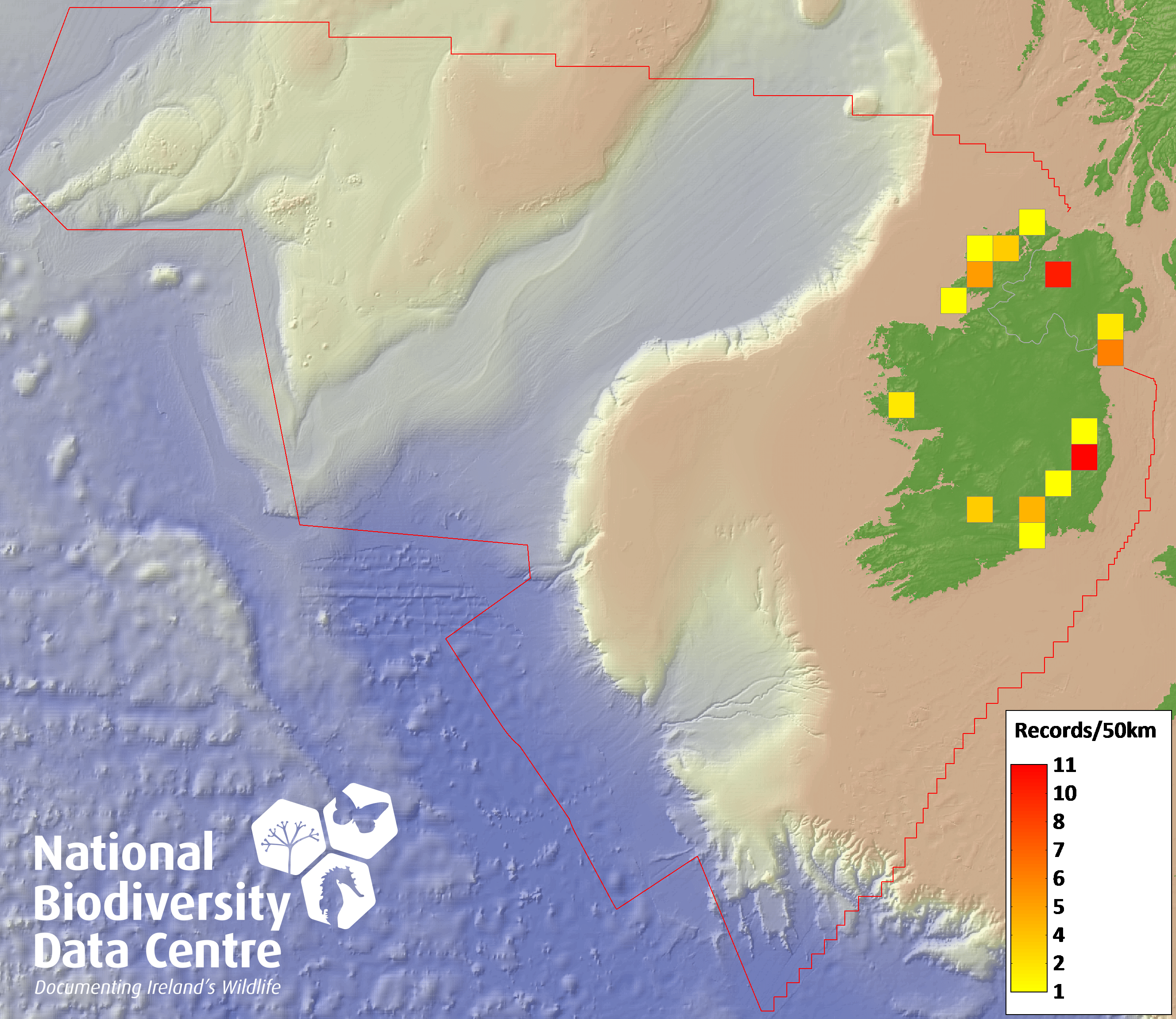 Distribution of the number of records recorded within each 10km grid square (ITM).Marine Map - 50km