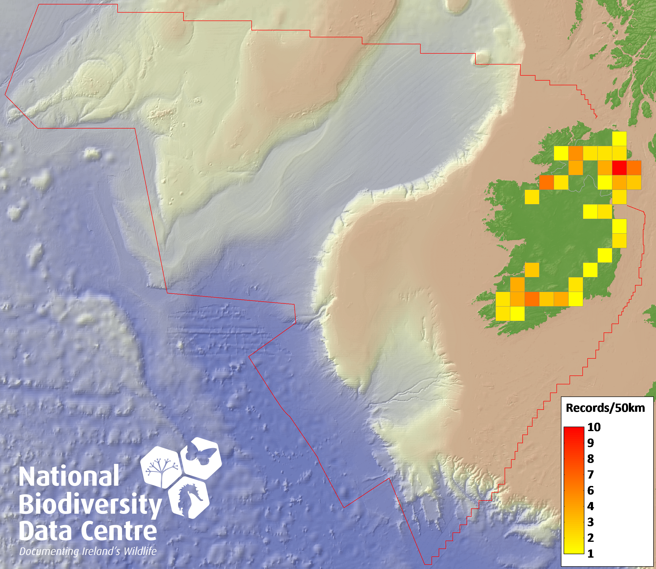 Distribution of the number of records recorded within each 10km grid square (ITM).Marine Map - 50km