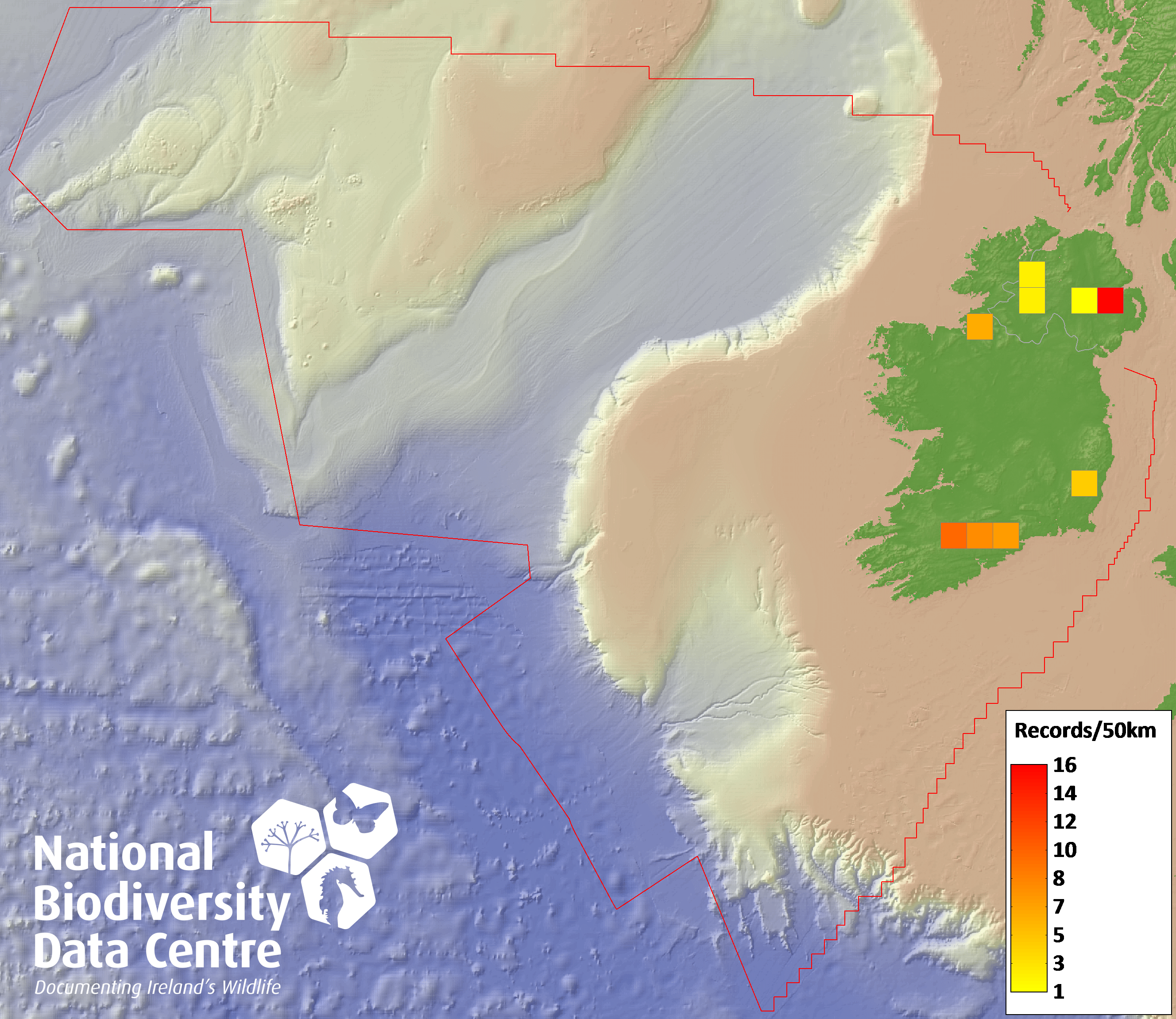 Distribution of the number of records recorded within each 10km grid square (ITM).Marine Map - 50km