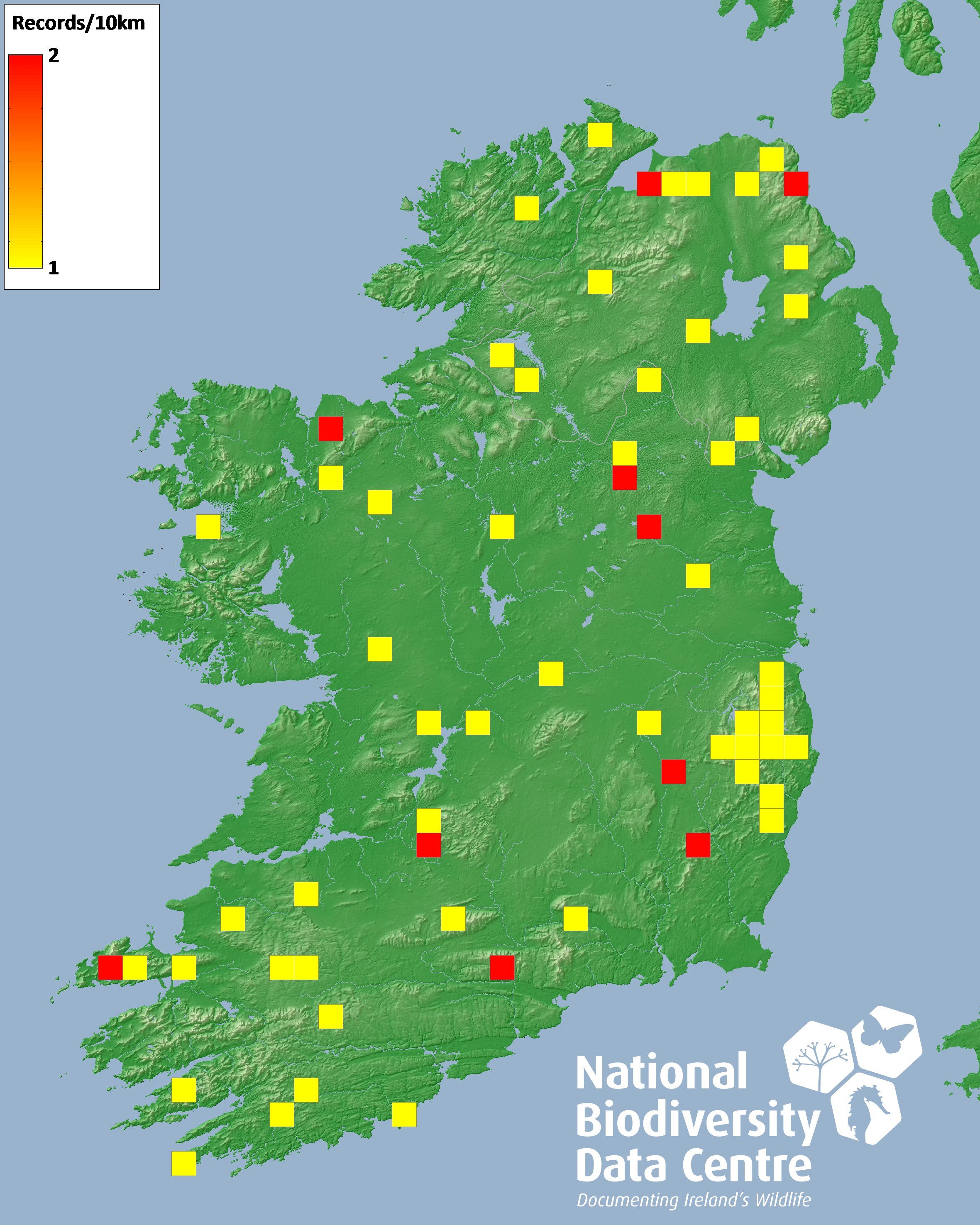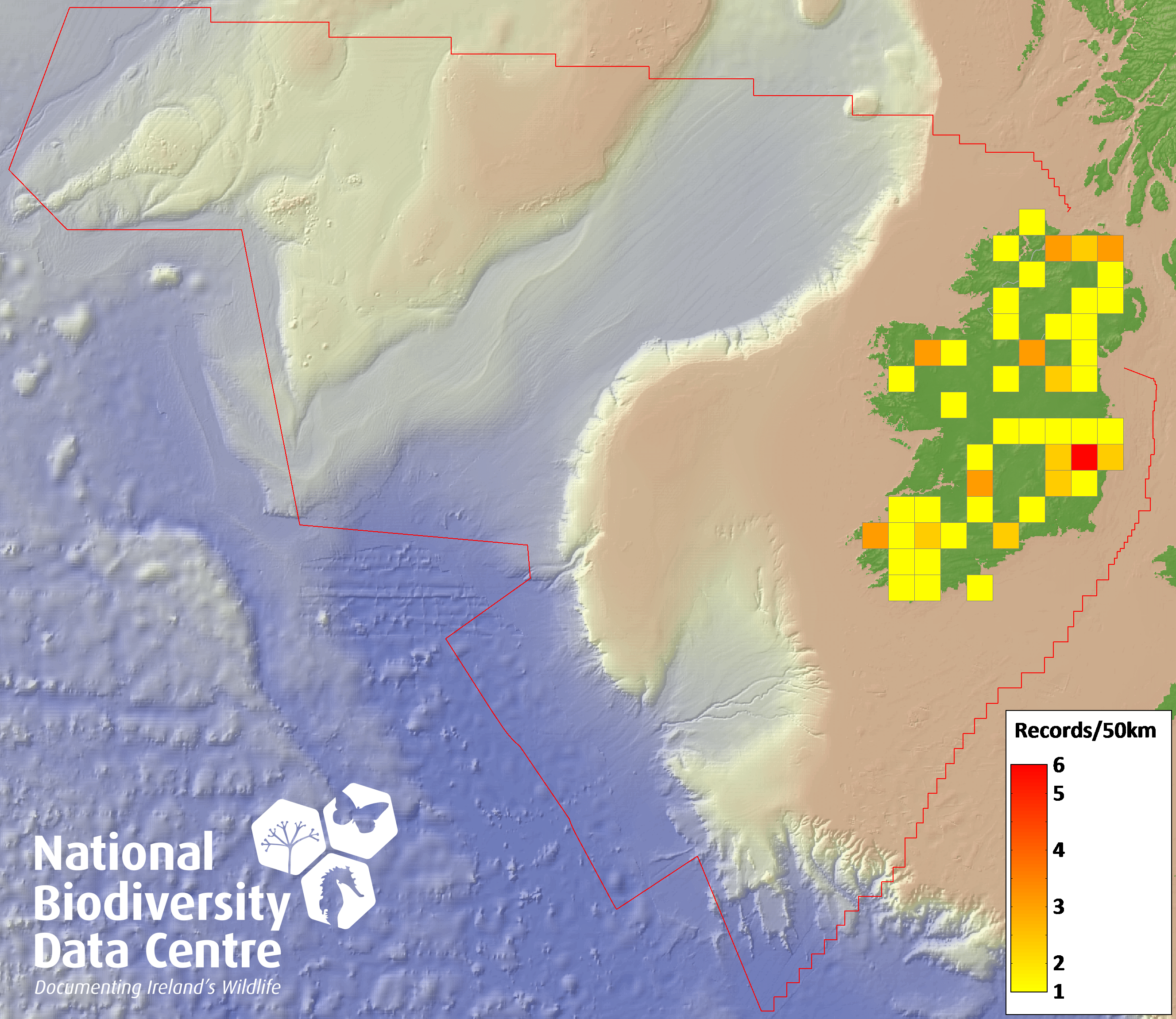 Distribution of the number of records recorded within each 10km grid square (ITM).Marine Map - 50km