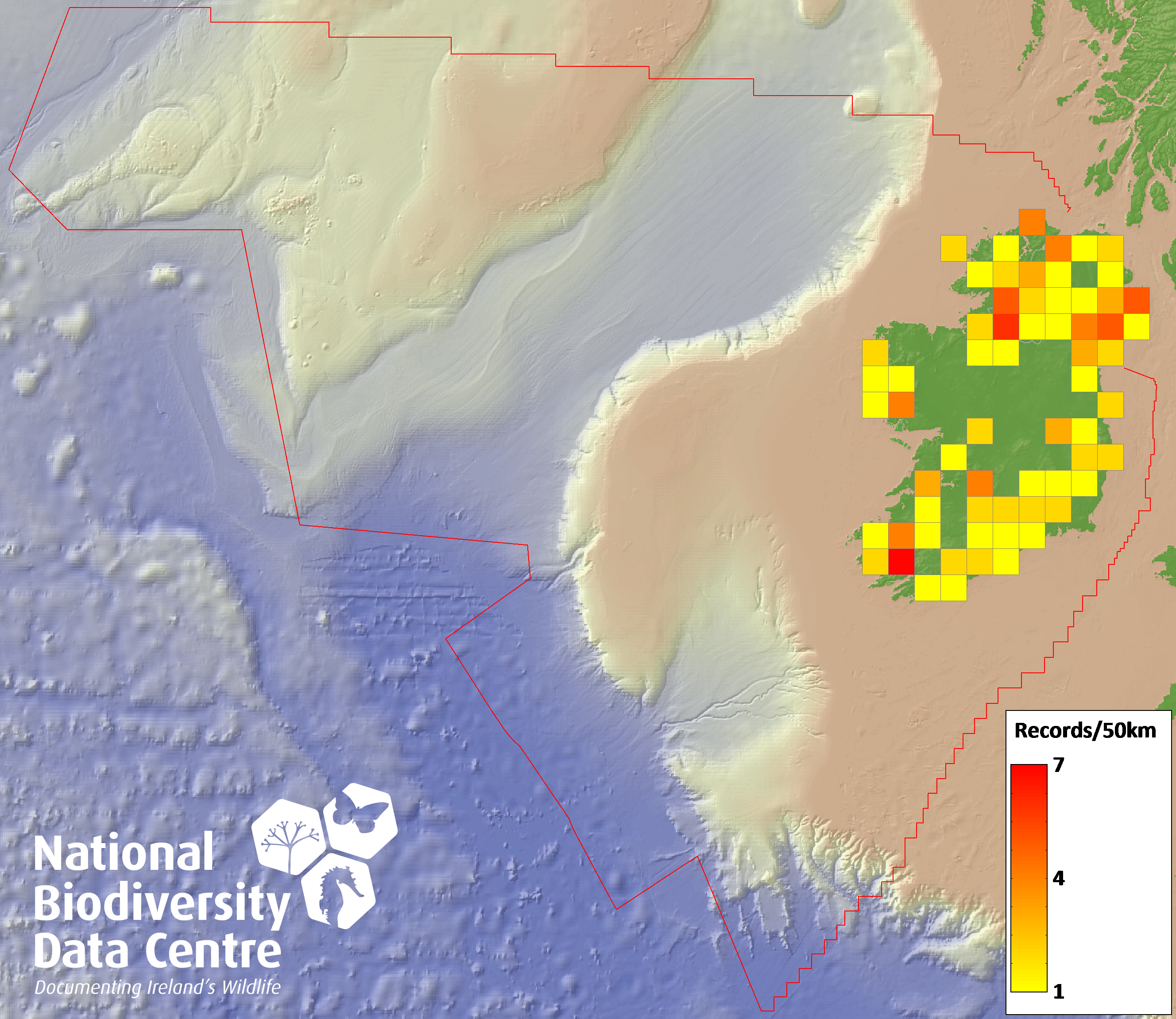 Distribution of the number of records recorded within each 10km grid square (ITM).Marine Map - 50km