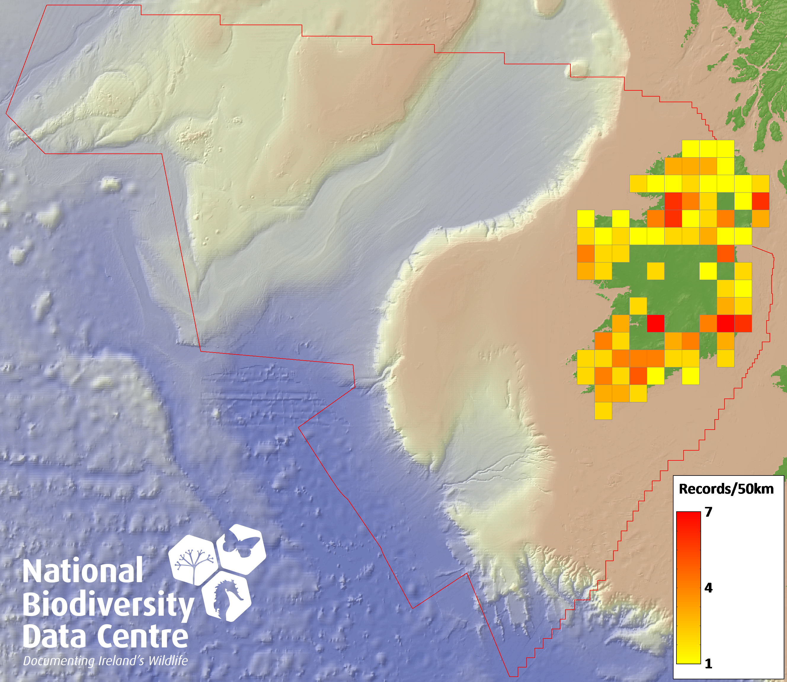 Distribution of the number of records recorded within each 10km grid square (ITM).Marine Map - 50km
