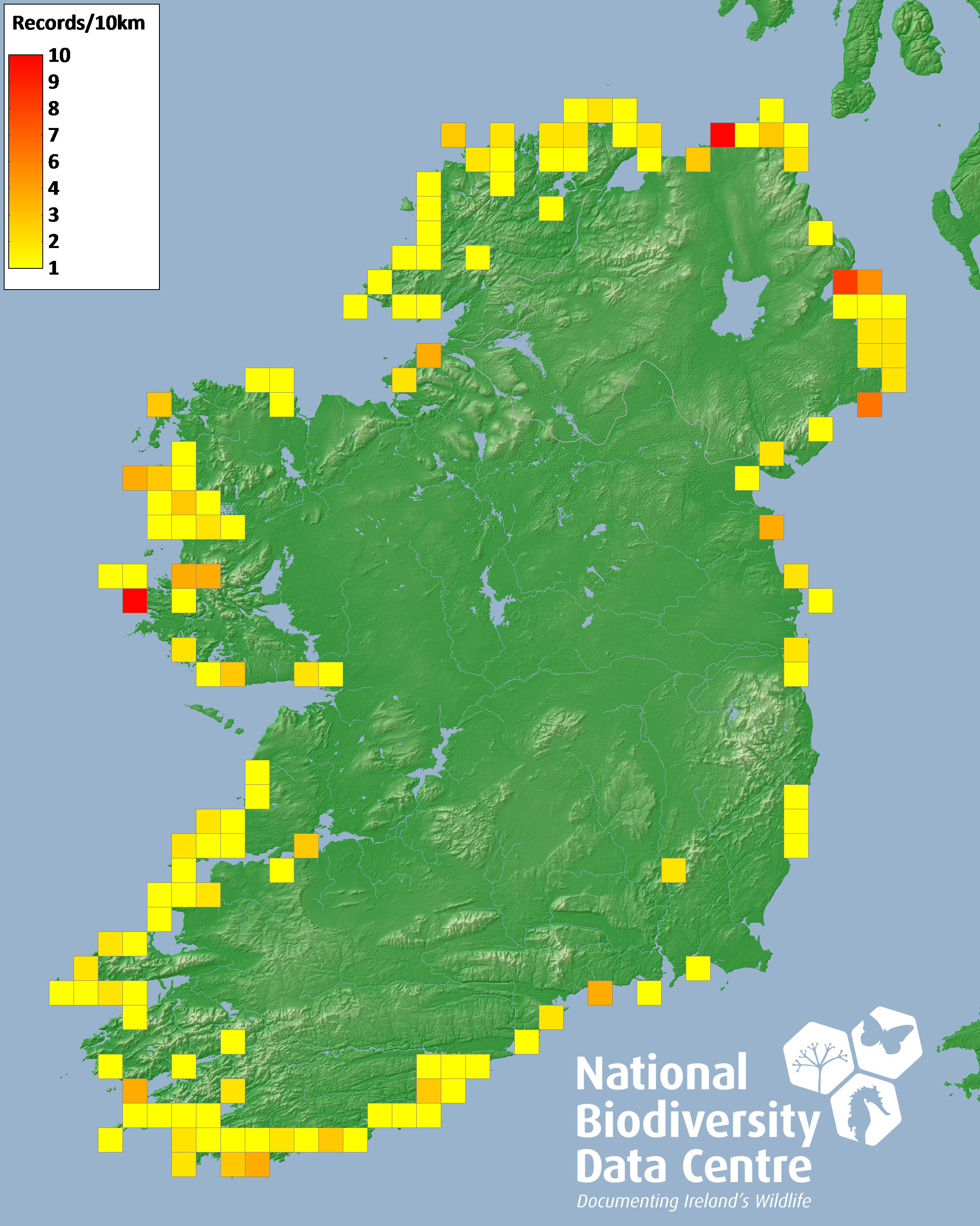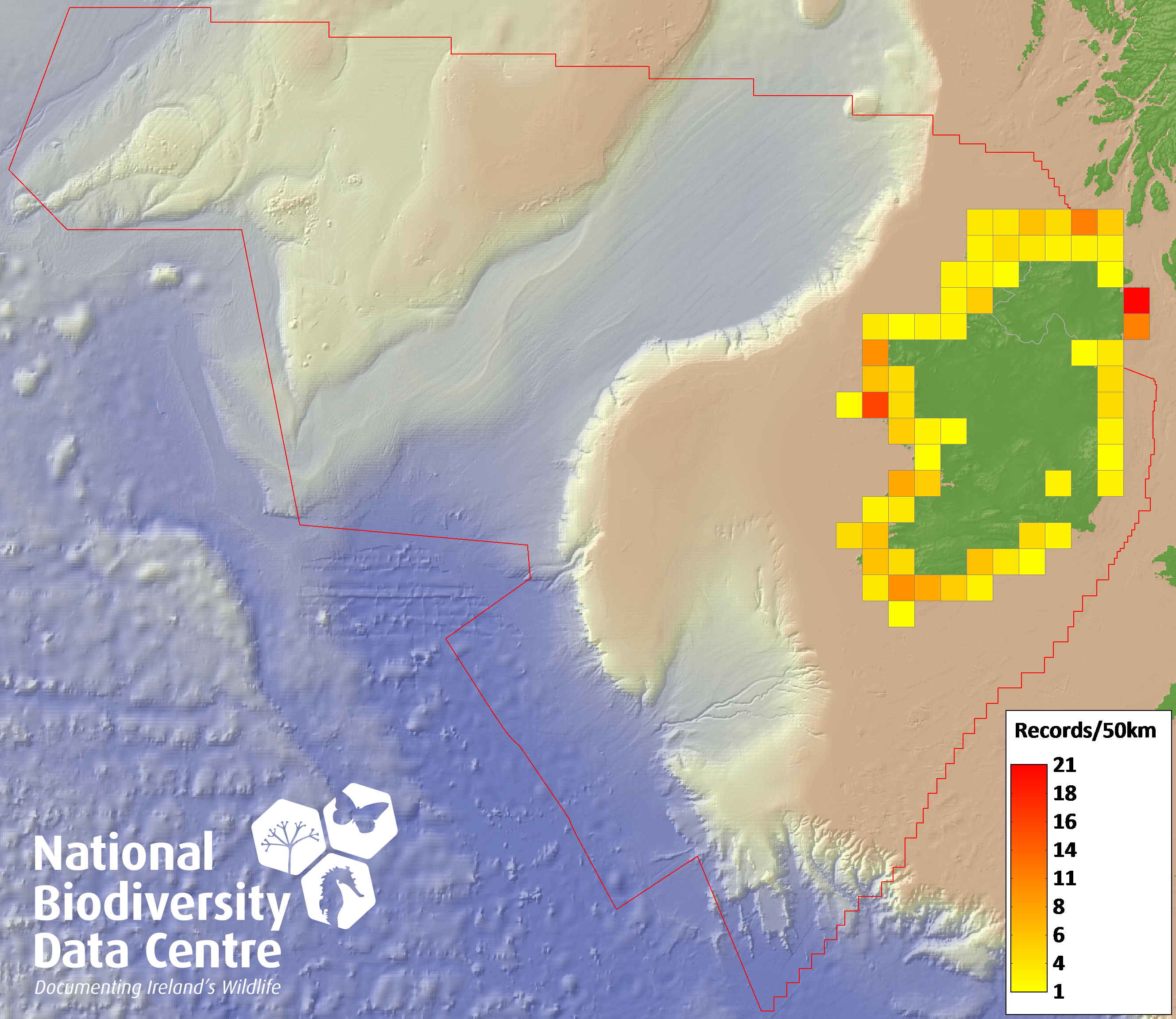 Distribution of the number of records recorded within each 10km grid square (ITM).Marine Map - 50km