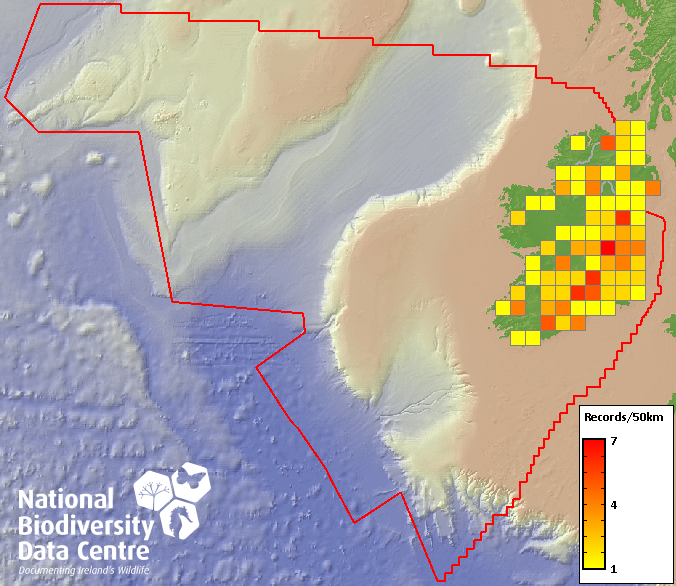 Distribution of the number of records recorded within each 10km grid square (ITM).Marine Map - 50km