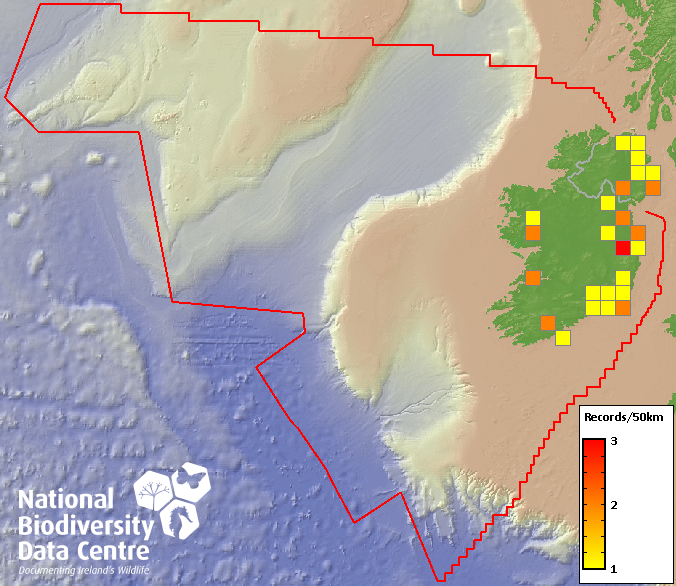 Distribution of the number of records recorded within each 10km grid square (ITM).Marine Map - 50km