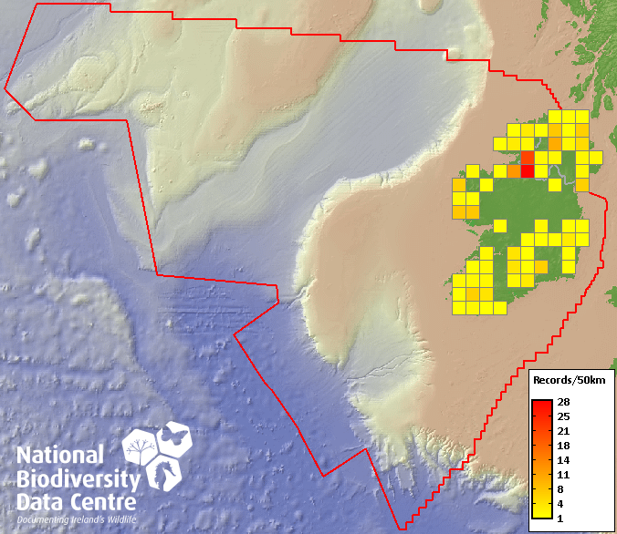 Distribution of the number of records recorded within each 10km grid square (ITM).Marine Map - 50km
