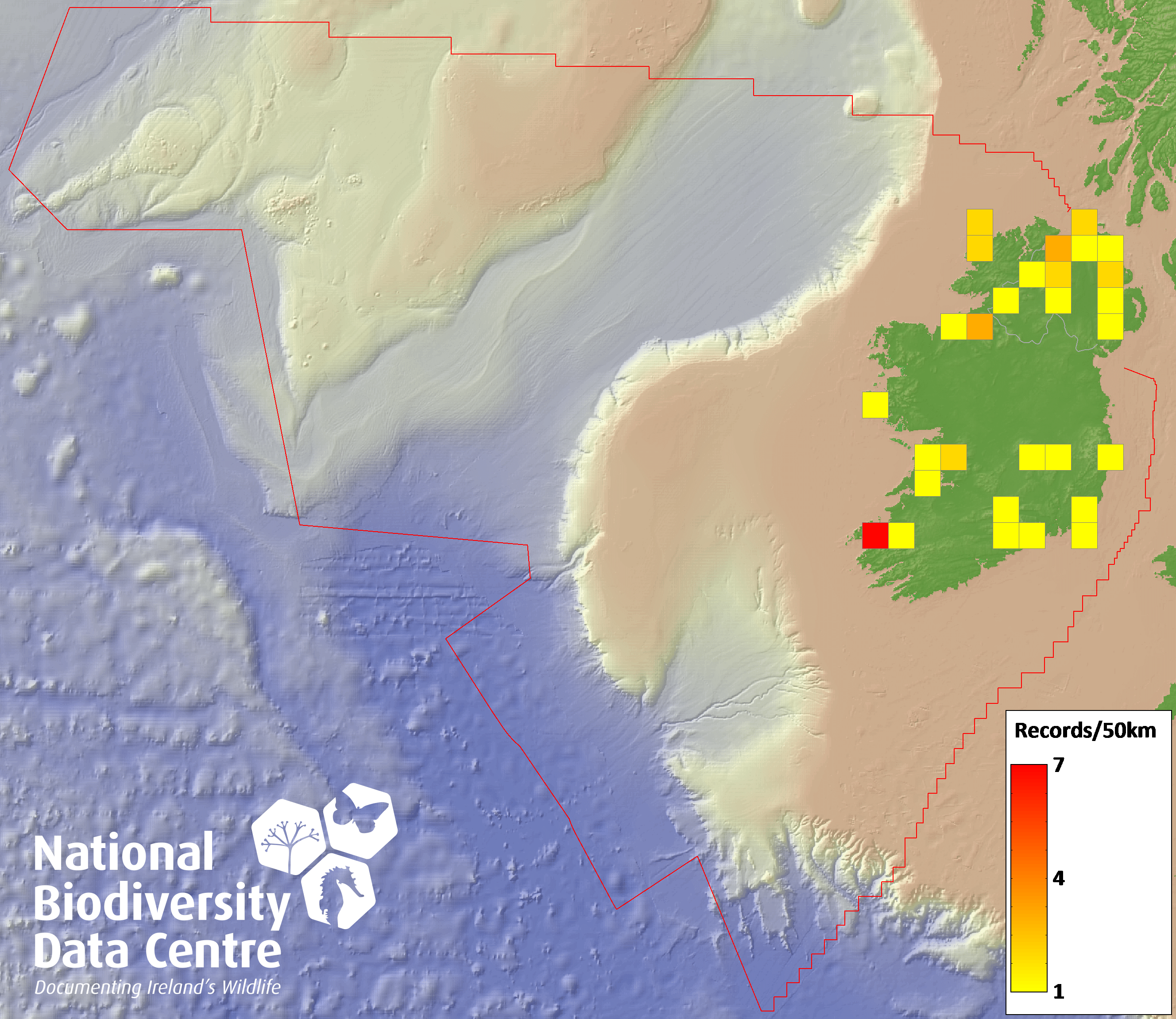 Distribution of the number of records recorded within each 10km grid square (ITM).Marine Map - 50km