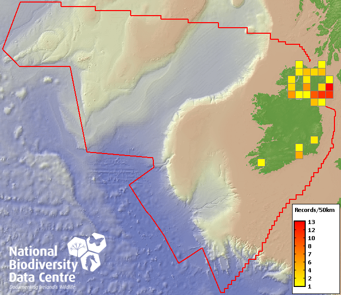 Distribution of the number of records recorded within each 10km grid square (ITM).Marine Map - 50km