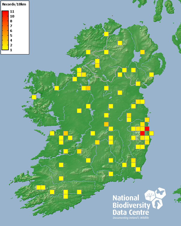 Distribution of the number of records recorded within each 10km grid square (ITM).Marine Map - 50km