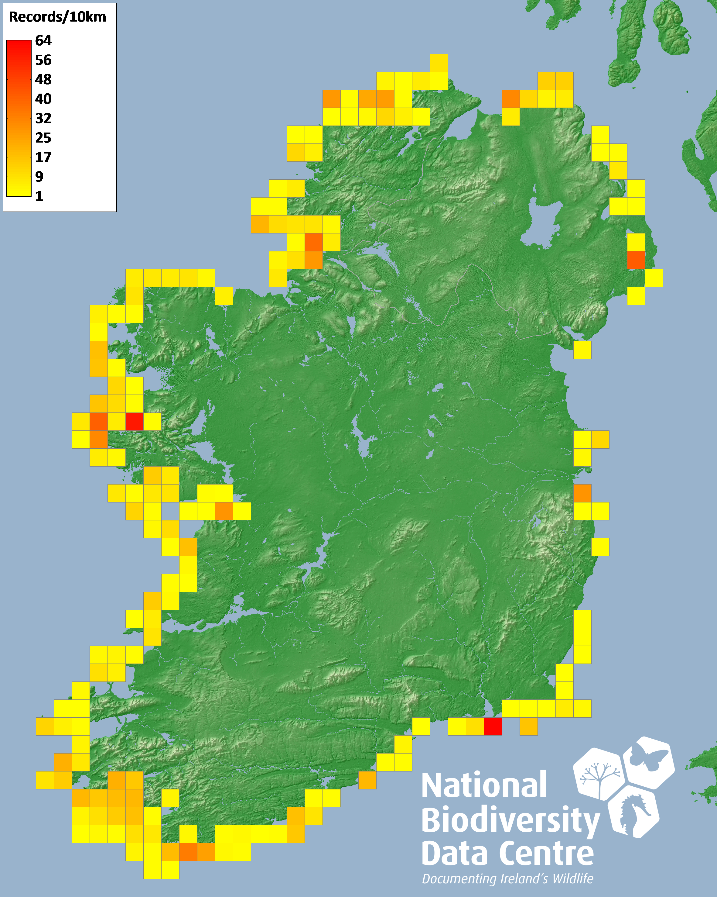 Distribution of the number of records recorded within each 10km grid square (ITM).Marine Map - 50km