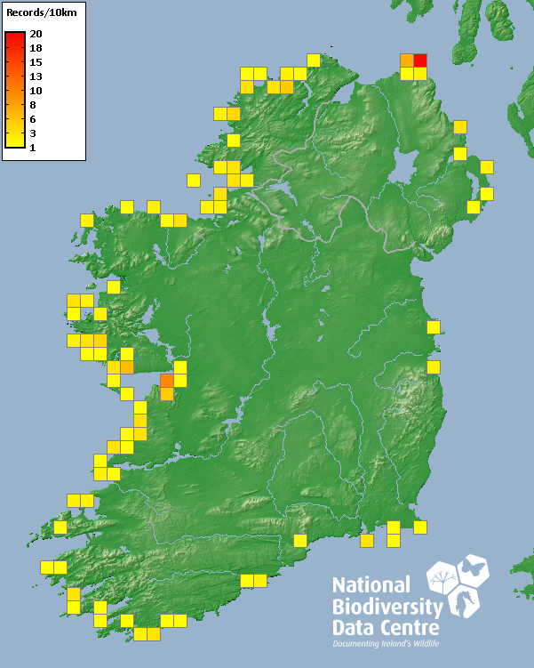 Distribution of the number of records recorded within each 10km grid square (ITM).Marine Map - 50km