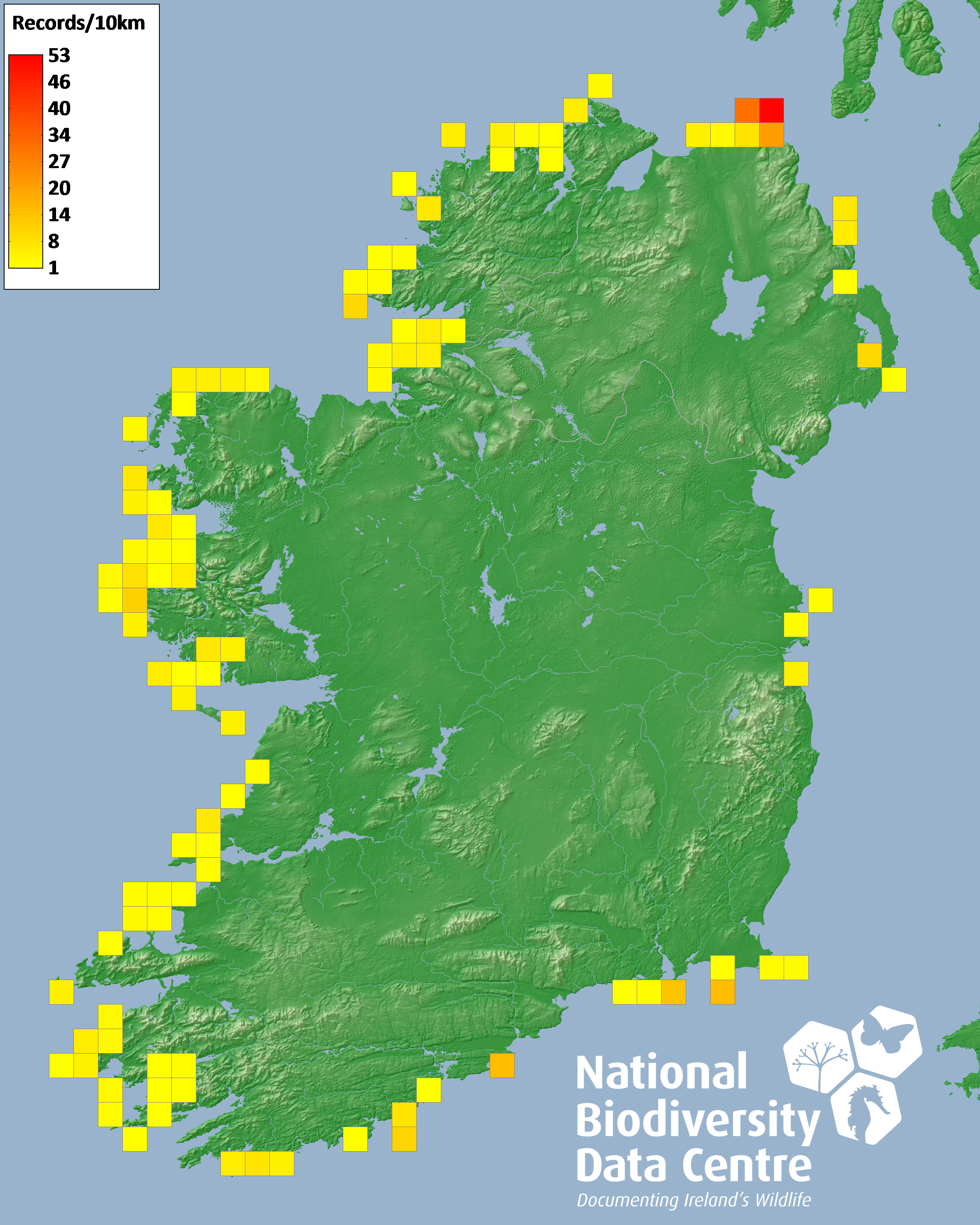 Distribution of the number of records recorded within each 10km grid square (ITM).Marine Map - 50km